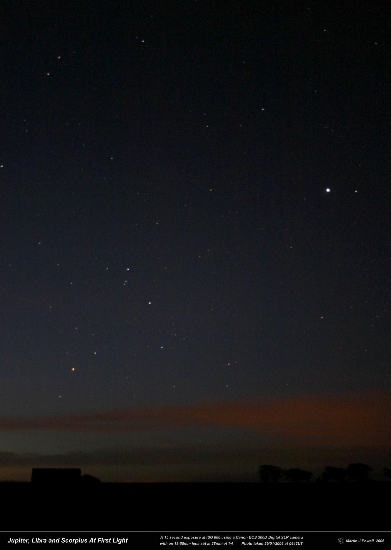 Jupiter, Libra and Scorpius At First Light Jupiter was in the constellation of Libra when this photo was taken at dawn in January 2006. Jupiter - the bright white 'star' visible towards the upper right - then shone at an apparent magnitude of -2.0, outshining all of the stars in its vicinity (move your cursor over the image - or click here - to identify Jupiter and the constellations, and click for a full-size picture). |