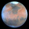 Mars is easily recognised since it has the most distinctive coloration of all the naked eye planets. Although it is popularly called 'The Red Planet', it rarely appears red to the naked eye; in fact, it varies from pale orange-yellow to orange-red, depending upon its distance from the Earth and therefore, its brightness. The reddish colour is caused by the presence of iron oxide (rust) on the planet's surface. Mars' attractive coloration has often given rise to descriptive terms such as "orange spark", "campfire orange", "pumpkin orange" and so on. Occasional global dust storms on Mars, such as those which happened in 2001 and 2007, can however make it appear decidedly yellowish. Because of its eccentric orbit, Mars' distance from the Earth varies considerably from one opposition to the next, which typically take place about every 2 years and 7 weeks (see Mars oppositions page). Mars' brightest (and best) oppositions occur in groups of two or three which repeat in a cycle of about 16 years, when its orbit brings it closest to the Earth (35 million miles/56 million kms distant). In the opposition of 2003, Mars came closer to the Earth than it had been for almost 60,000 years. For about six weeks either side of opposition, Mars can clearly be seen in twilight; at its brightest, Mars outshines Sirius (the brightest star in the night sky) but even at its more distant oppositions it outshines the star Arcturus (magnitude -0.0). Note that because of Mars' eccentric orbit, the dates of its opposition and its closest approach to the Earth can differ by up to two weeks. When it is on the far side of its orbit from the Earth (i.e. in between oppositions) Mars appears as an unremarkable, orange-red 'star', shining only about as bright as the stars of Orion's Belt for much of the time. Through a telescope, Mars typically appears amber or salmon-pink in color. It is a difficult planet to observe - despite its relative closeness - since it is only about half the size of the Earth. Under good atmospheric seeing conditions, small telescopes will reveal one or other of its polar caps and some bluish-grey surface markings which often change their appearance with the Martian seasons. Mars has two asteroid-like moons, Phobos and Deimos. They are too faint to be seen with binoculars and can only be seen with medium and large-sized telescopes around opposition - and even then, only when their orbits carry them well clear of the planet's bright disk. A device known as an occulting bar can be used to conceal Mars from view in the telescopic eyepiece, allowing the moons to be spotted with greater ease. |