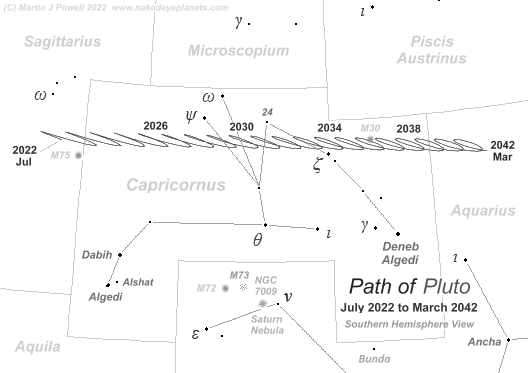 Star map showing the path of Pluto from July 2022 through to March 2042. Pluto moved from the constellation Serpens Cauda - with a brief transition through Ophiuchus - into Sagittarius in late 2006 (see star map here). The dwarf planet spent some time in Capricornus during 2023 but re-entered that constellation for the long-term at the start of 2024. After describing 'zig-zag' fomations through much of Sagittarius, Pluto describes 'hybrid' formations (half loop, half zig-zag) through to the late 2020s, after which they begin to open out into full, Southward-facing loops; in this region of its orbit the loops average about 2º.4 across (measured from eastern to western stationary points - for more details, see the Planet Movements page). Pluto's opposition magnitude fades during the period of the star map from +14.3 to +14.9. |
