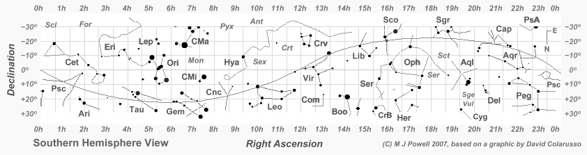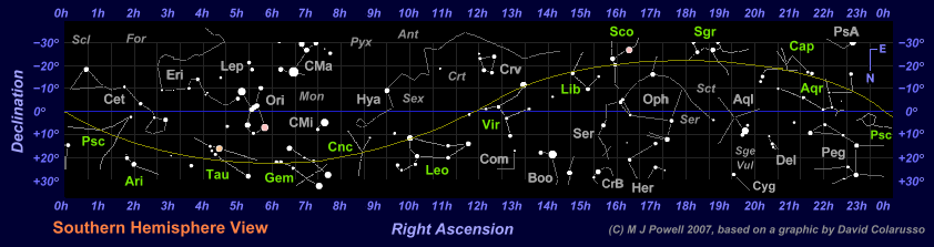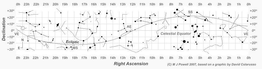 | Star map showing the path of the Ecliptic through the Constellations The ecliptic (yellow curve) is the apparent path of the Sun through the constellations, as seen from the orbiting Earth. Its path forms the basis of the twelve well-known zodiac constellations (Pisces, Aries, Taurus, etc). The naked-eye planets and the Moon follow the ecliptic very closely, hence they will always be found on or near the yellow curve in this diagram. Move your cursor over the diagram (or click here) to reveal the constellation names in their abbreviated three-letter form - the full names are listed here). Zodiac constellations are labelled in green and non-zodiac constellations in grey. A Southern hemisphere view of the labelled constellations can be seen here. The significant solar positions marked on the chart apply to the Northern hemisphere and are as follows: VE = Vernal (Spring) Equinox, SS = Summer Solstice, AE = Autumnal Equinox and WS = Winter Solstice. The numbers along the sides of the chart (Right Ascension and Declination) are co-ordinates of celestial longitude and latitude which astronomers use to locate the position of a celestial body in the night sky (the overlay grid marks intervals of 10º in celestial longitude and latitude). Printer-friendly versions of the above chart are available for the constellation patterns only, the labelled constellations and the Southern hemisphere view. |
