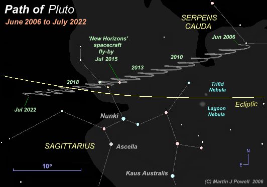 Pluto cannot be seen with the naked eye and is only visible in fully dark skies through medium or large-sized telescopes. A detailed star map, showing very faint stars, is required to locate it. |
