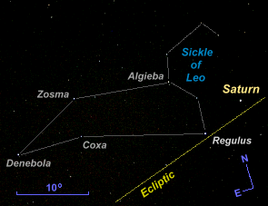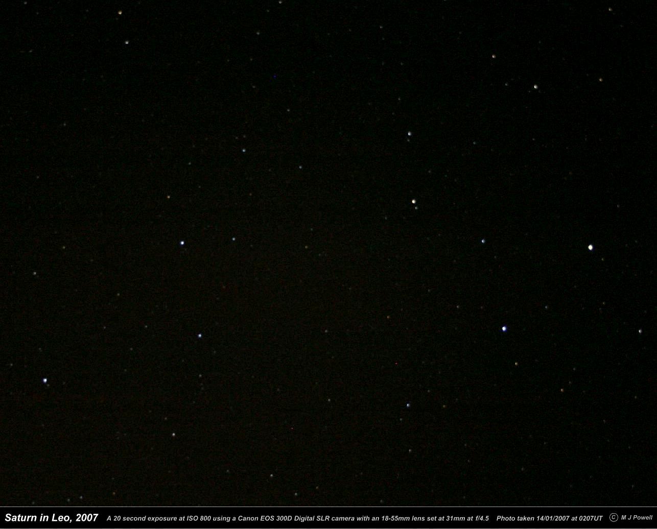 Saturn in Leo, 2007 Between 2006 and 2009, golden-yellow Saturn appeared as an additional bright 'star' in the constellation of Leo, the Lion (move your cursor over the image - or click here - to identify the stars, and click for a full-size picture). |