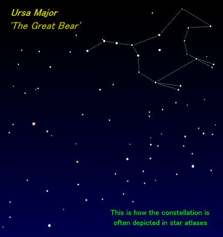 In the final frames of the animation, Ursa Major (The Great Bear) appears with his head facing towards the East, as depicted by the late writer and illustrator H. A. Rey in the 1950s. Star atlases often show The Bear facing in the opposite direction (West), e.g. as illustrated here. |