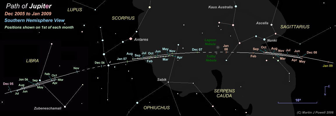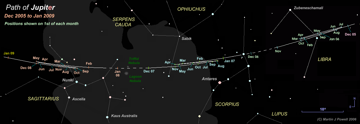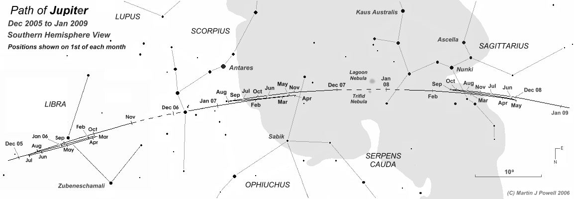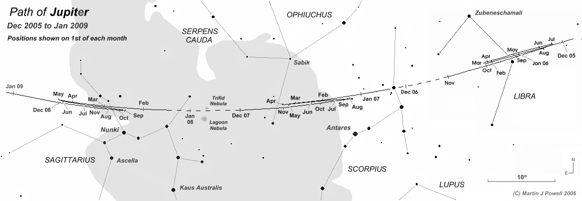The path of Jupiter against the background stars of Libra, Scorpius, Ophiuchus and Sagittarius from December 2005 to January 2009, with positions marked at the start of each month. Periods when the planet was unobservable (i.e. when it was too close to the Sun, or passed behind it) are indicated by a dashed line. Hence the planet became lost from view (in the evening sky) in early November 2006 and became visible again (in the morning sky) in early December 2006. The chart shows to good effect how the shape of a planet's apparent looping formation transforms as it moves through the zodiac. In 2006, Jupiter described a conventional North-facing loop. In 2007, the loop became 'hybrid' (half loop, half zig-zag) and became a full zig-zag as it crossed the ecliptic (heading Southwards) in 2008. The star map applies to observers in the Northern hemisphere (i.e. North is up); for the Southern hemisphere view, click here (the Southern hemisphere chart should be used by observers situated south of the Tropic of Capricorn [23½° South]). The Milky Way is shown in dark grey; the faintest stars shown on the map have an apparent magnitude of about +4.8. Printer-friendly versions of this chart are available for Northern and Southern hemisphere views. |
