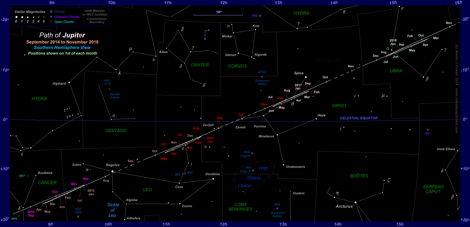 From 2015 to 2018, observers at mid-Northern latitudes saw Jupiter's transit altitude reduce significantly year by year as the planet headed Southward through Leo, Virgo and Libra, the planet crossing the celestial equator in September 2016. For Southern hemisphere observers, viewing circumstances improved year-on-year throughout the period.
