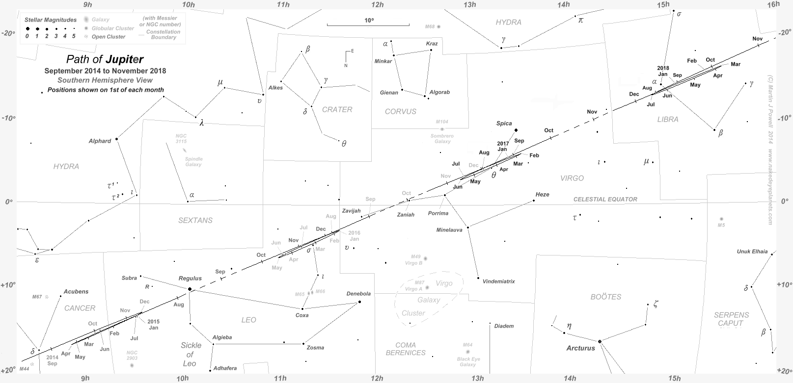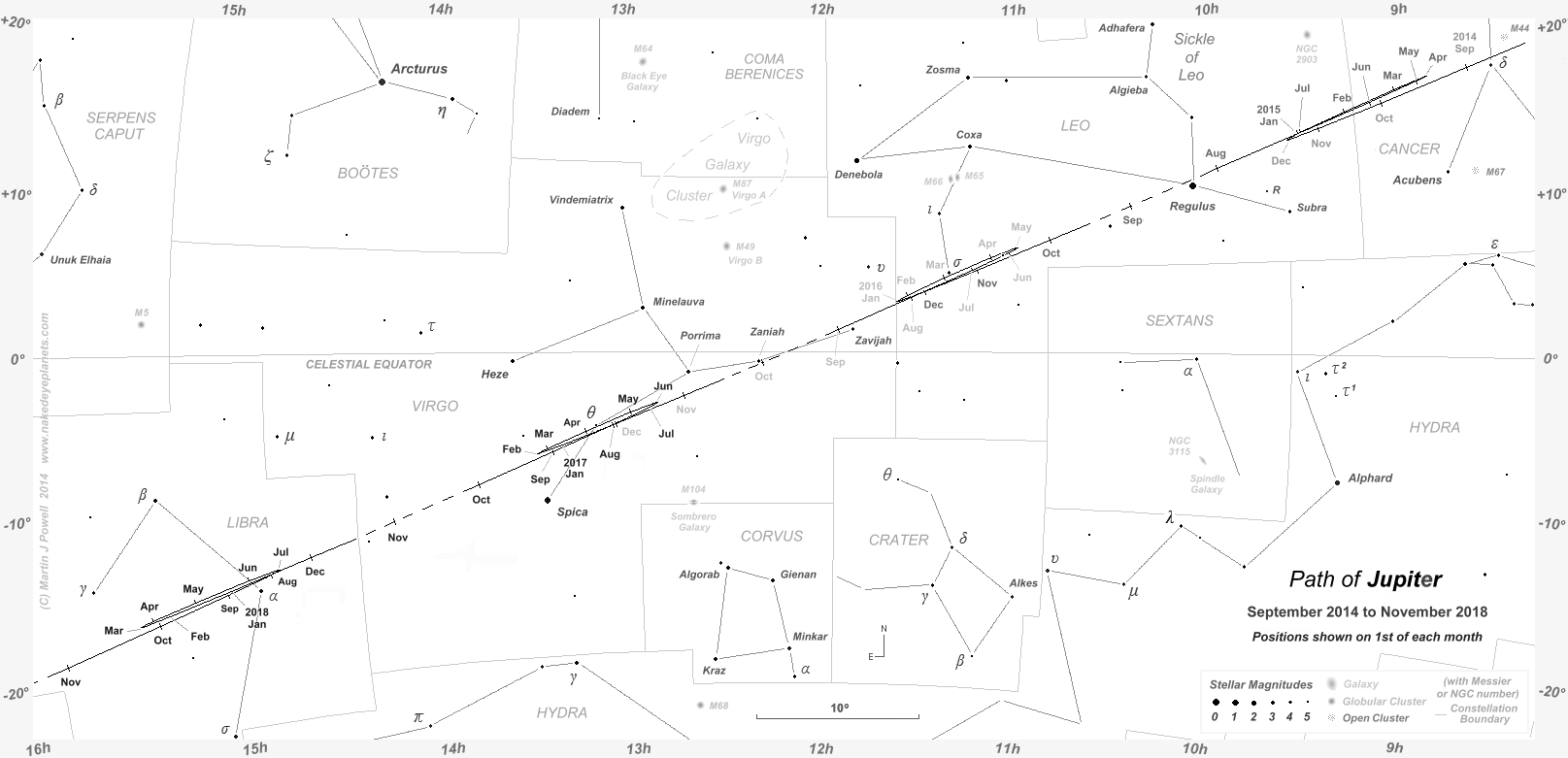 As it slowly moves along the 'celestial highway' known as the ecliptic (the apparent path along which the Sun, Moon and planets move through zodiac) Jupiter passes numerous bright stars; the bright stars passed by the planet between August 2014 and December 2018 are listed below, in chronological order: