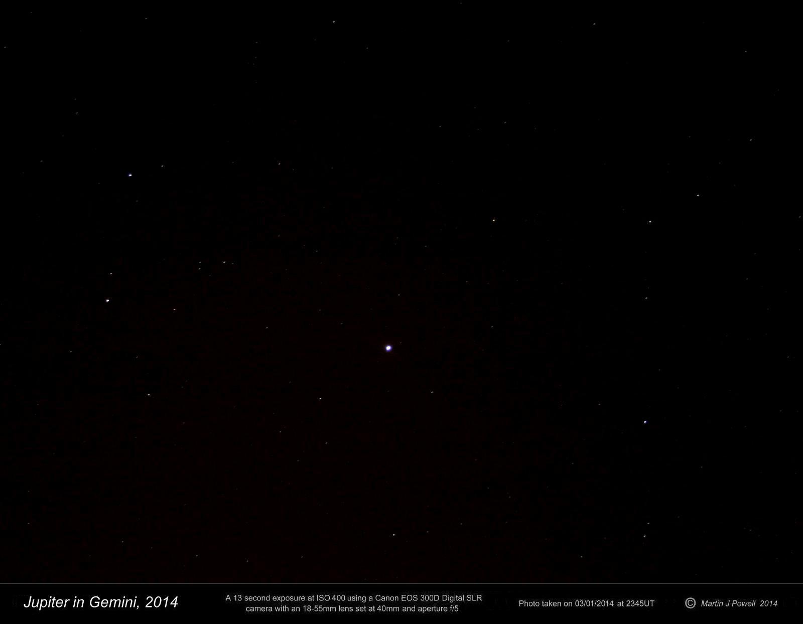 | Jupiter in Gemini, the Twins photographed by the writer two days before the planet's opposition in January 2014. Jupiter was positioned in Gemini for a little over a year between 2013 and 2014, reaching its highest point in the zodiac in March 2014. Throughout the period the planet formed a variety of triangle shapes with the constellation's two brightest stars Castor and Pollux (roll your pointer over the image for an annotated version and click on the thumbnail for the full-size photo). |