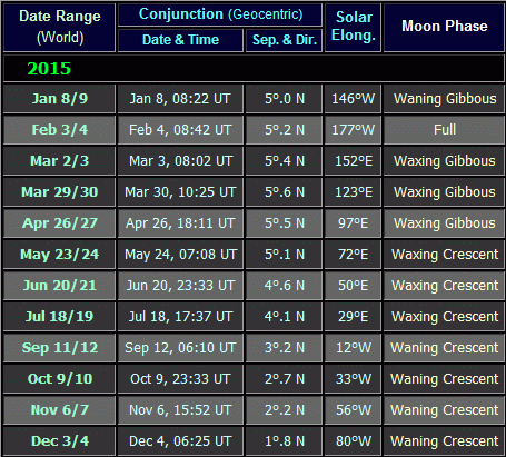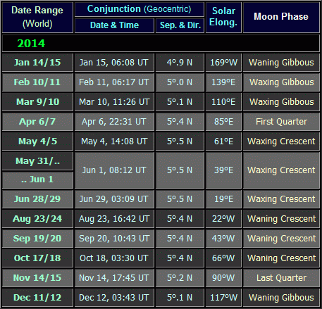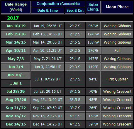 The Moon moves relatively quickly against the background stars in an Eastward direction, at about its own angular width (0º.5) each hour (about 12º.2 per day). Because it is relatively close to the Earth, an effect called parallax causes it to appear in a slightly different position (against the background stars) when seen from any two locations on the globe at any given instant; the further apart the locations, the greater the Moon's apparent displacement against the background stars. Therefore, for any given date and time listed in the table, the Moon will have appeared closer to Jupiter when seen from some locations than from others. For this reason, the dates shown in the table should be used only for general guidance.