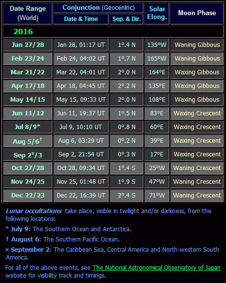 Jupiter conjunctions with other planets from August 2014 to December 2018 The column headed 'UT' is the Universal Time (equivalent to GMT) of the conjunction (in hrs : mins). The separation (column 'Sep') is the angular distance between the two planets, measured relative to Jupiter, e.g. on 2016 Aug 27, Venus was positioned 0°.1 North of Jupiter at the time shown. The 'Favourable Hemisphere' column shows the Hemisphere in which the conjunction was best observed. The expression 'Not high N Lats' indicates that observers at latitudes further North than about 45°N will have found the conjunction difficult or impossible to observe because of low altitude and/or bright twilight. In the 'When Visible' column, a distinction is made between Dawn/Morning visibility and Dusk/Evening visibility; the terms Dawn/Dusk refer specifically to the twilight period before sunrise/after sunset, whilst the terms Evening/Morning refer to the period after darkness falls/before twilight begins (some conjunctions take place in darkness, others do not, depending upon latitude). The 'Con' column shows the constellation in which the planets were positioned at the time of the conjunction. To find the direction in which the conjunctions were seen on any of the dates in the table, note down the constellation in which the planets were located ('Con' column) on the required date and find the constellation's rising direction (for Dawn/Morning conjunctions) or setting direction (for Dusk/Evening conjunctions) for your particular latitude in the Rise-Set direction table. |