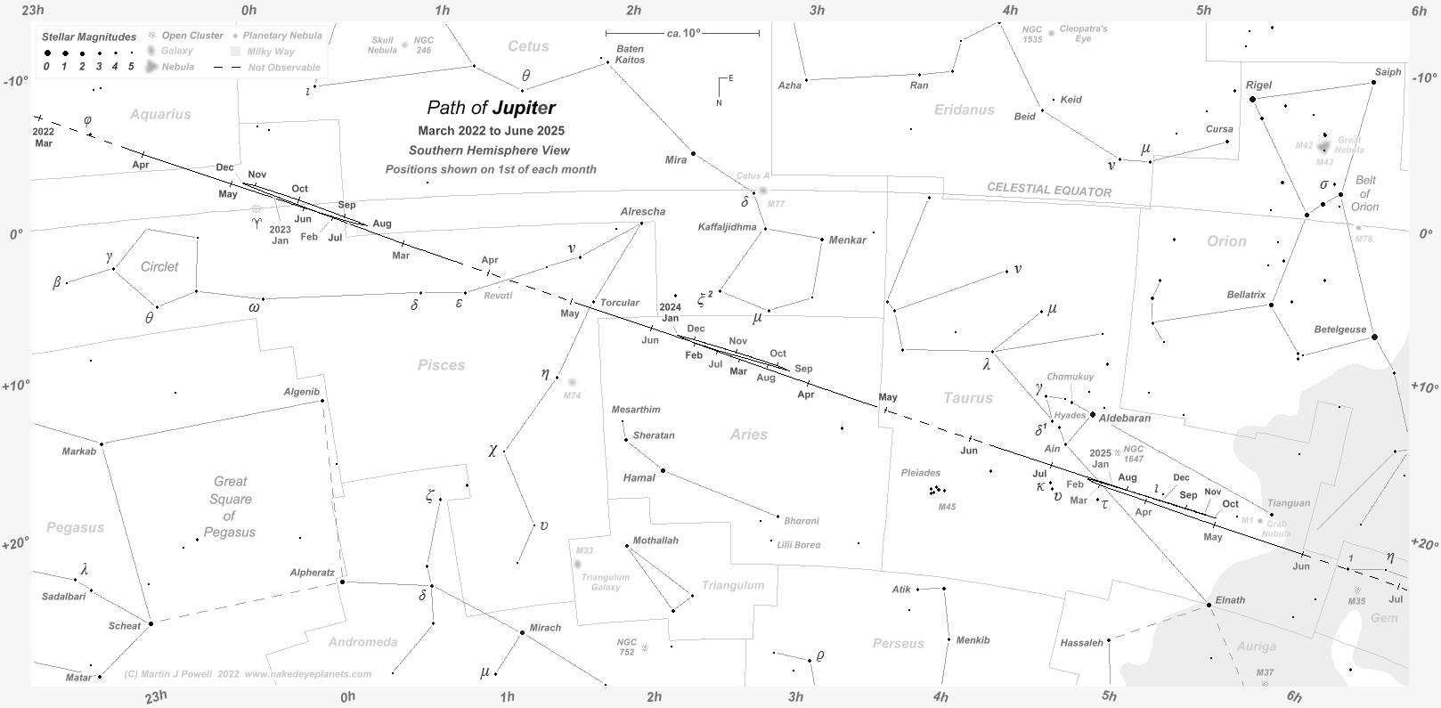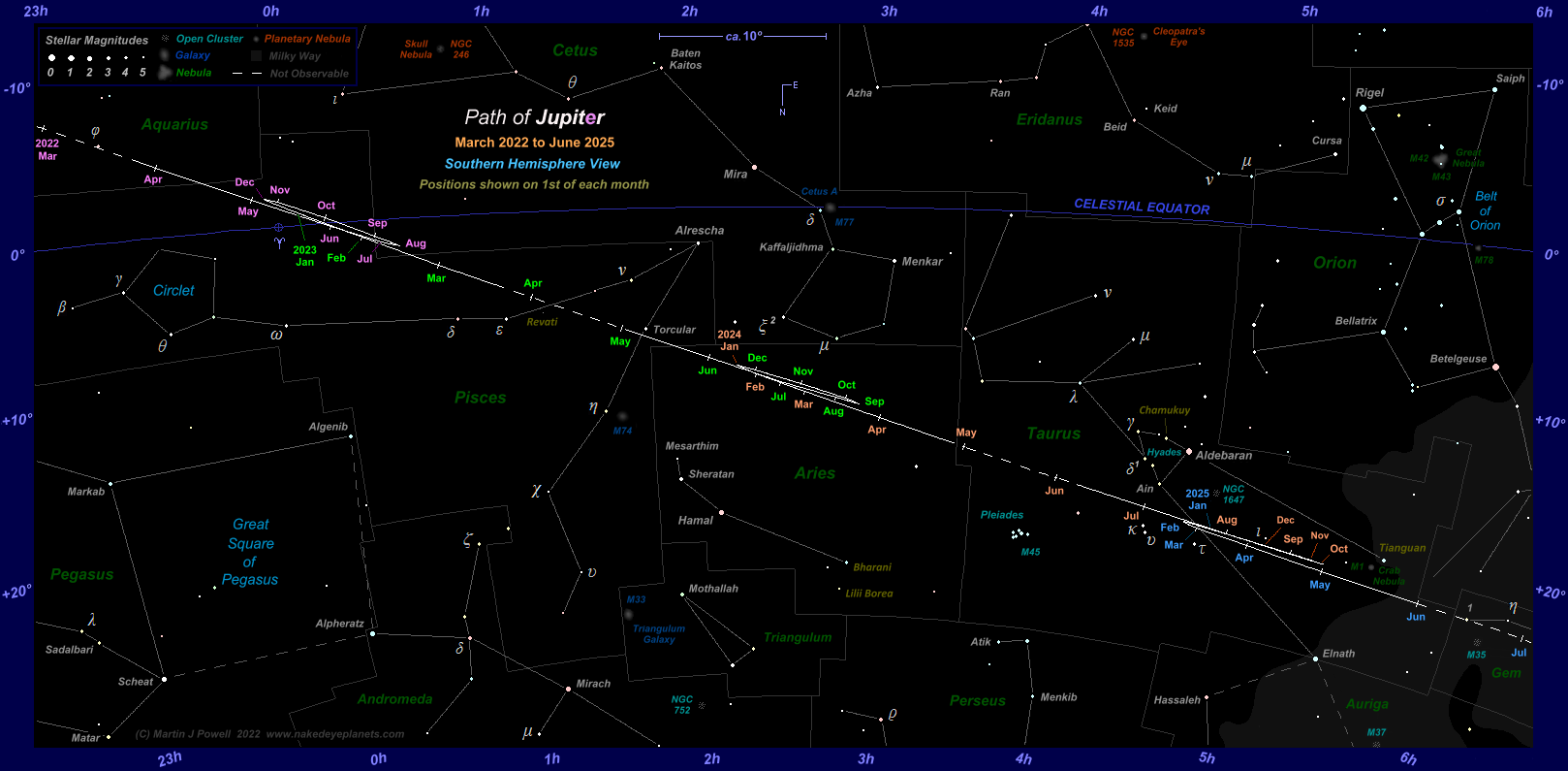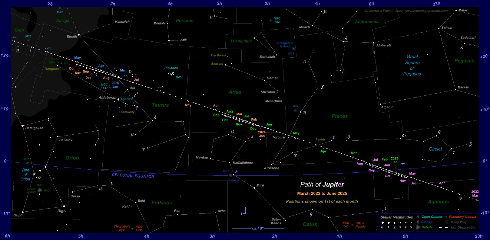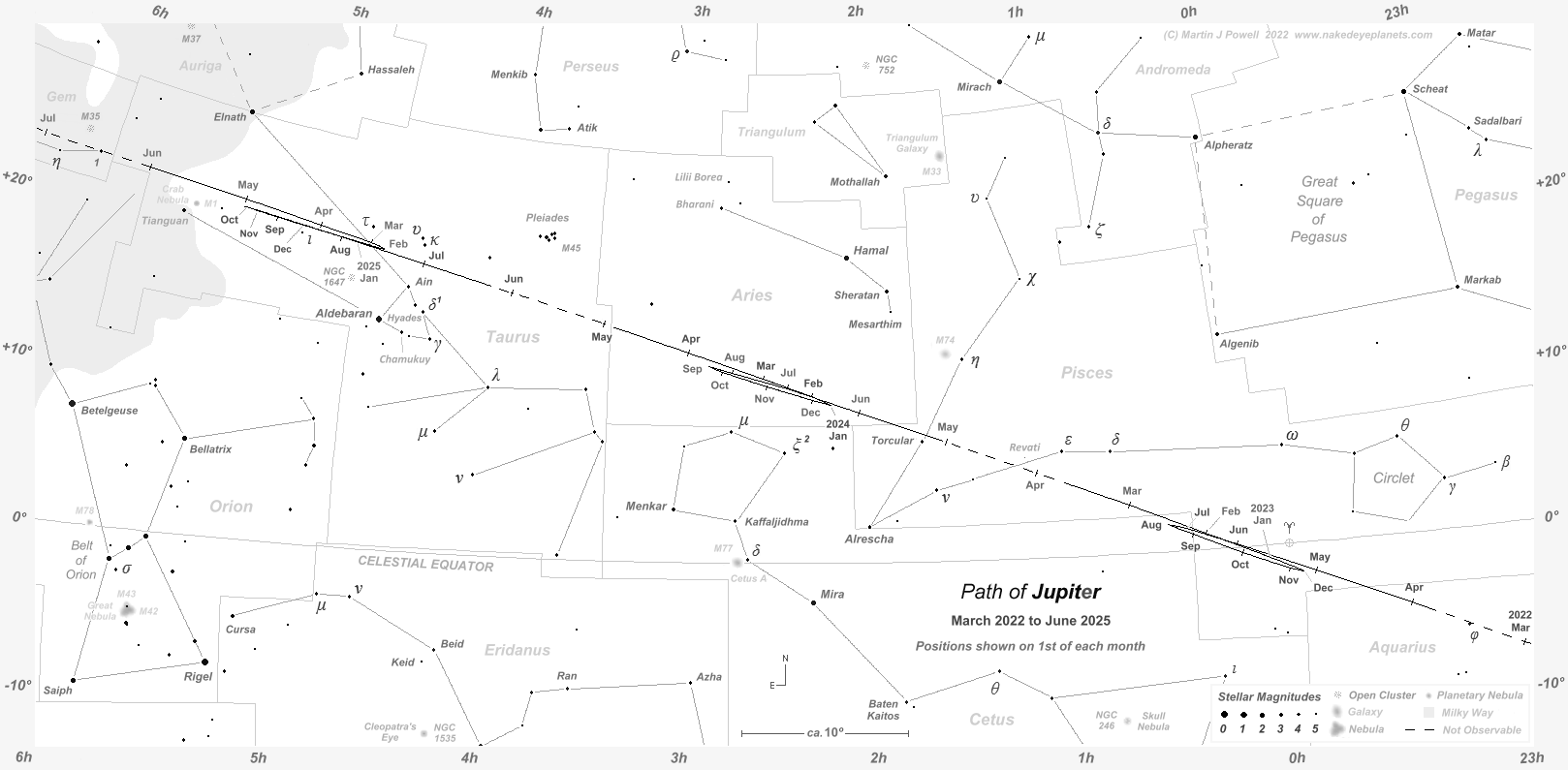 Where is Jupiter tonight? This star map shows the path of Jupiter through Pisces, Aries and Taurus from March 2022 to June 2025. Click for full-size image (Copyright Martin J Powell, 2022)