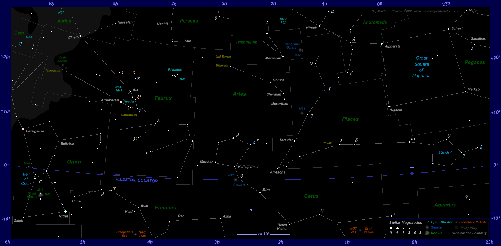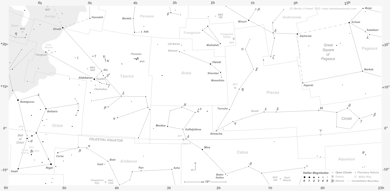 Jupiter entered Pisces in mid-April of 2022, crossing to the North of the celestial equator (where the declination of a celestial body is 0°) in late May. The planet entered the non-zodiacal constellation of Cetus, the Whale or Sea Monster, in late June, cutting across the constellation's North-western corner. Jupiter reached its Eastern stationary point in late July before turning retrograde (moving East to West) and describing its 2022-23 loop in Southern Pisces, straddling the celestial equator. Jupiter re-entered Pisces at the start of September, reaching opposition (its closest and brightest orbital position in relation to the Earth for that year) in the fourth week of that month, when it was positioned on the celestial equator; it was also the planet's closest and brightest opposition in twelve years. The planet continued its retrograde motion and reached its Western stationary point in late November, positioned only 2° to the SSW of the First Point of Aries (Right Ascension = 0 hours, 0 minutes 0 seconds), where the Sun crosses the celestial equator in a Northward direction at the Vernal (Spring) equinox. Jupiter then resumed direct motion (West to East), crossing to the North of the celestial equator once more in mid-January 2023. The planet entered Cetus again in early February of that year, again clipping its North-western corner, re-entering Pisces through its Southern border around mid-month. Jupiter headed out of view in the dusk twilight in late March 2023, marking the end of the planet's 2022-23 apparition.