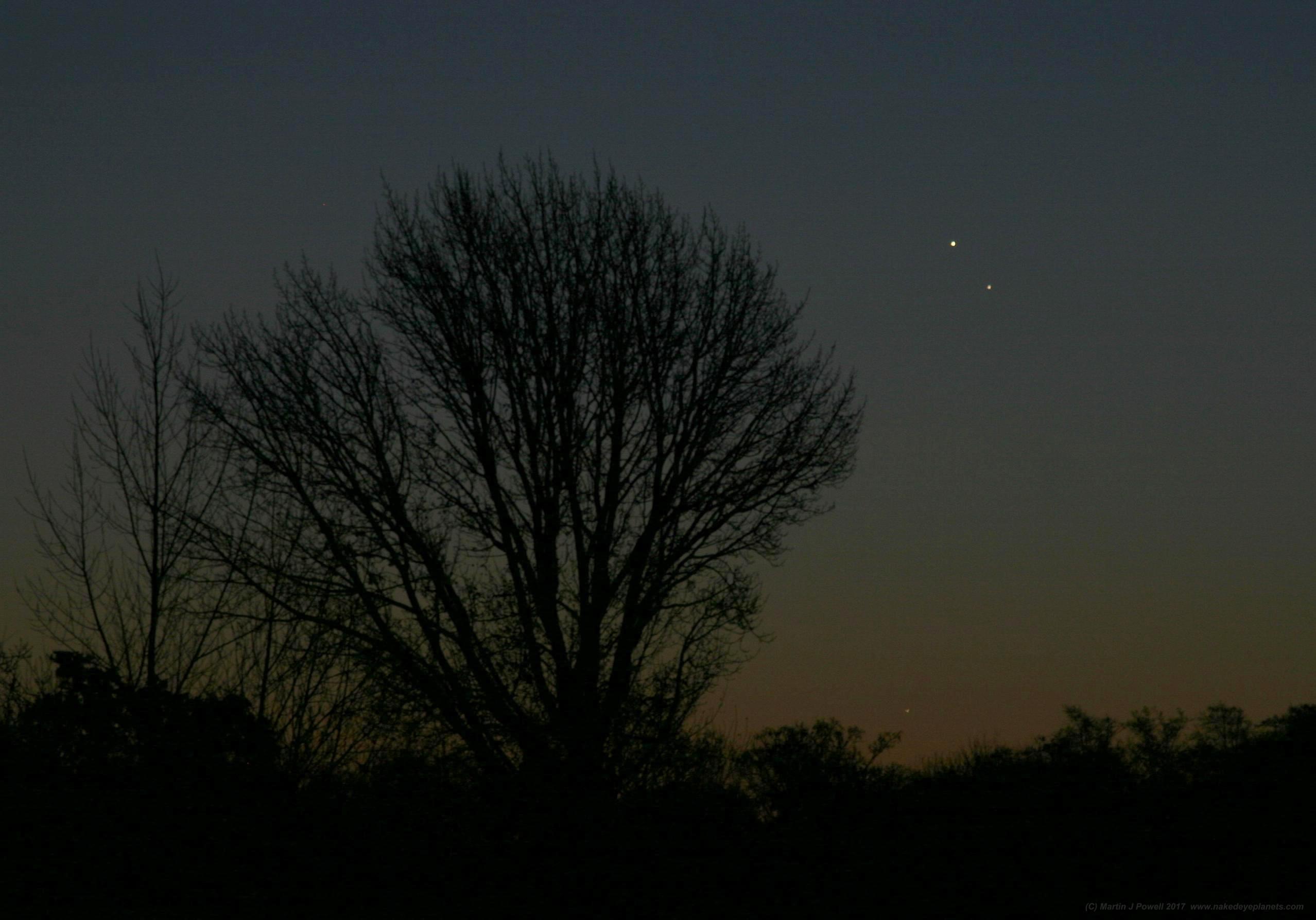 The only evening conjunction of the period was between Jupiter and Venus on March 2nd 2023 in central Southern Pisces. It was ideally positioned for the Northern hemisphere due to the steep angle of the ecliptic in the Western sky after sunset at this time of year; it was rather less spectacular when seen from the Southern hemisphere, where the pair were seen at lower horizon altitudes. The angular separation of 32' (0°.53) was twice that of April 2022. At latitude 60° North Jupiter and Venus were at a respectable 20° high in the WSW as Jupiter became visible in the dusk twilight, whilst at 40° North they were 26° high. The highest altitudes were in the Northern Tropics where they were 28° high in the West at Jupiter's first appearance. In the Southern hemisphere the pair were in the WNW upon Jupiter's first appearance, the altitudes being as follows: 22° at latitude 15° South, 18° at 25° South, 14° at 35° South and only 9° at 45° South (where the pair were seen in twilight throughout). The planets set in darkness at latitudes North of about 32° South.