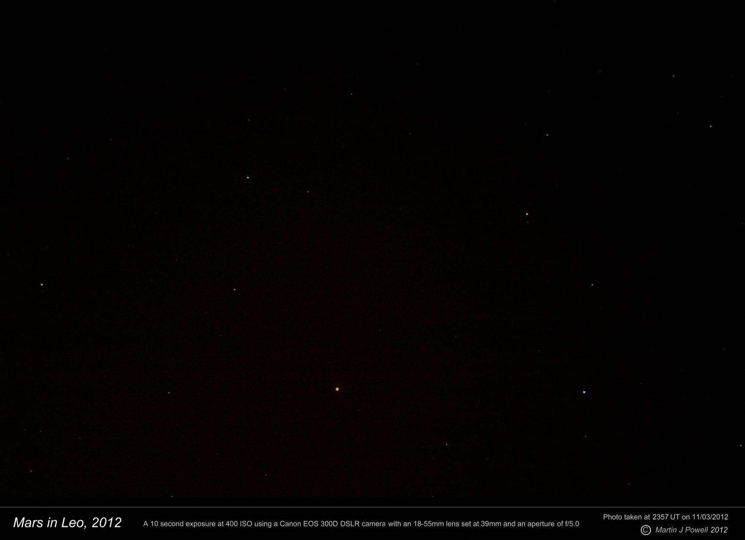 | Mars in Leo, 2012 The Red Planet previously reached opposition in Leo in early March 2012; this photograph was taken about a week after that date, when it shone at magnitude -1.2 (move your cursor over the image - or click here - to identify the stars, and click on thumbnail for a full-size picture). |