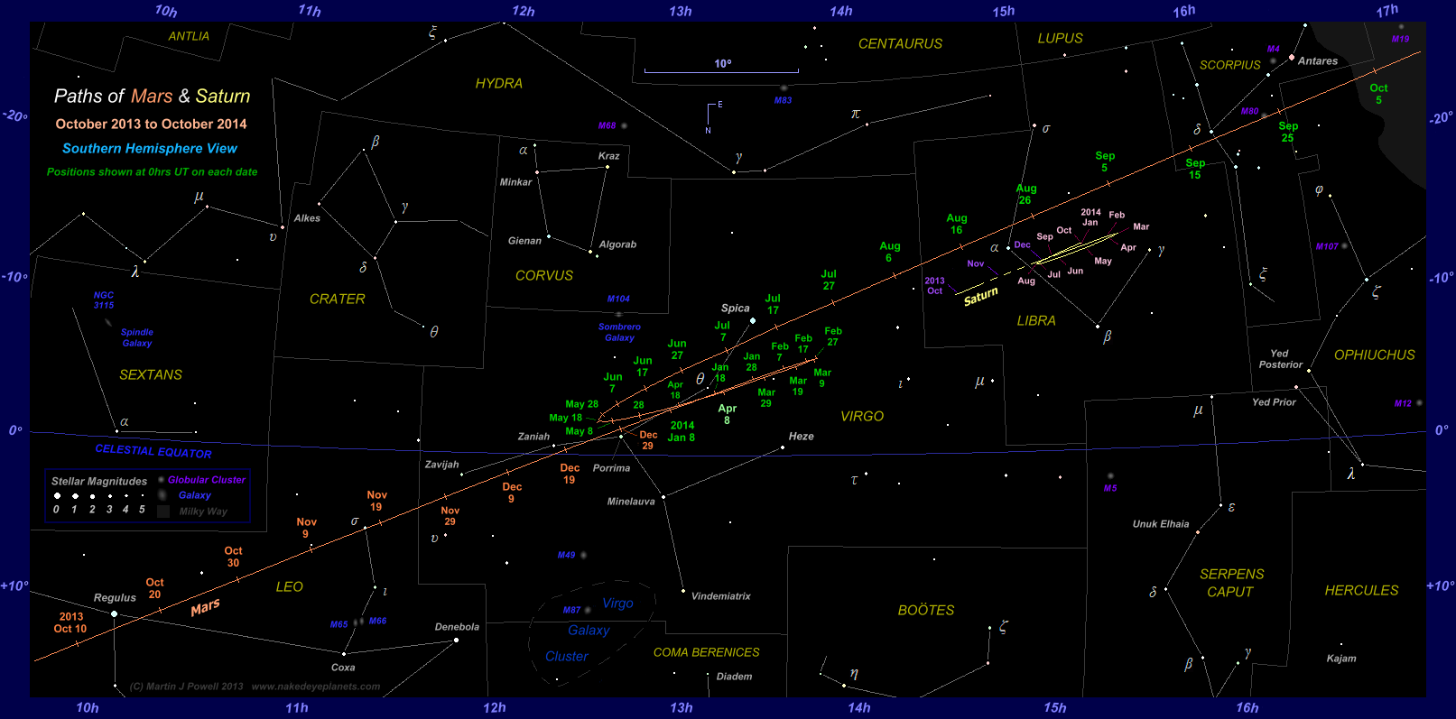 Lying to both North and South of Mars' path through the zodiac from 2013-14 are numerous interesting deep-sky objects (objects beyond our Solar System) which can be seen through small telescopes and binoculars. More details can be found on the Zodiacal Sky: Cancer-Leo-Virgo page.