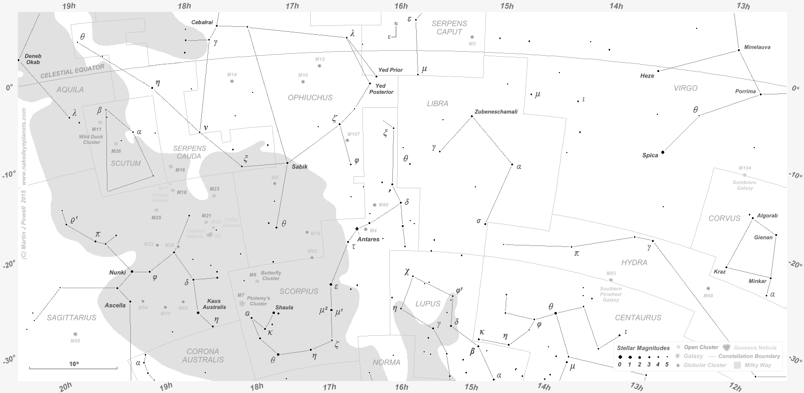 | Virgo, Libra, Scorpius, Ophiuchus and Sagittarius Photographs showing the region of the night sky through which Mars passed during the year following December 2015 (click on the thumbnails for their full-size equivalents). In the Virgo photo, stars are visible down to an apparent magnitude of about +7.5; in the Libra & Northern Scorpius photo the limiting magnitude is about +7 whilst that of the Sagittarius photo is about +8.1. Note that the three photographs do not have the same scale because of the differing camera lens settings and image resolutions. |