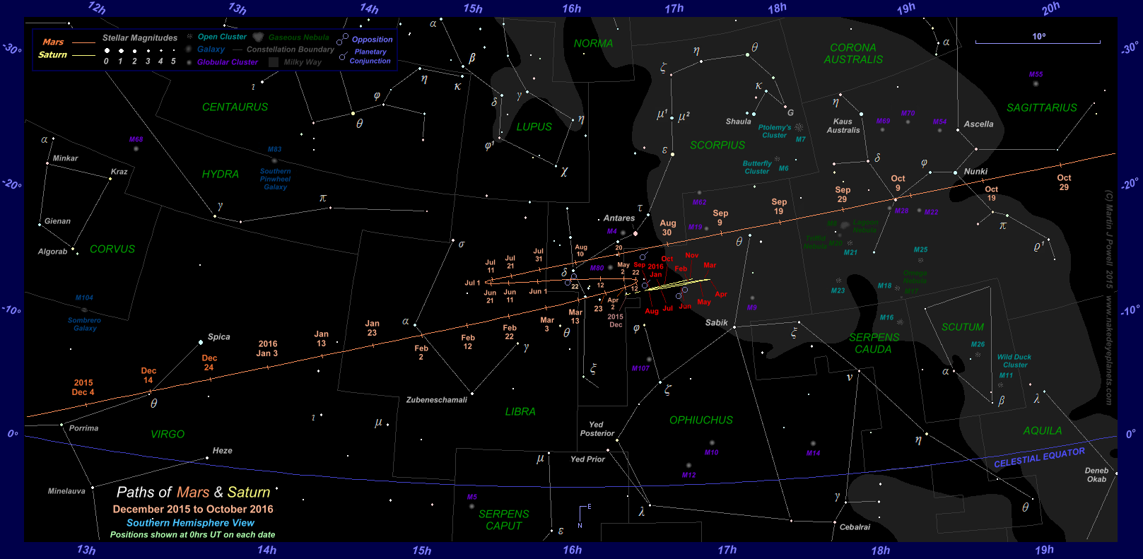 The most interesting Martian conjunction of the 2015-17 apparition was that with Saturn in the evening sky on August 25th 2016. Taking place in Southern Ophiuchus just three months after both planets' opposition dates, it was also the brightest of the six conjunctions, Mars and Saturn being at either end of 'zeroth magnitude'. This was the only conjunction of the six which truly favoured the Southern hemisphere. At the moment of their first appearance at dusk, the two planets were positioned at the zenith (directly overhead) at 25° South, 80° above the Northern horizon at 35° South and 70° above the Northern horizon at 45° South. Despite the relatively wide solar elongation of 97°, twilight and low altitude interfered with observation from mid- and high-Northern latitudes. This was caused by the dual effect of the planets' high Southerly declinations and the shallow angle of the ecliptic to the local horizon after sunset at this time of year. On this occasion Mars and Saturn were separated by a wide 4º.4, so that they were too far apart to fit within a telescopic field of view but were well within the typical view of binoculars. In 2016 the pair only narrowly missed out on multiple conjunction events (i.e. double or triple conjunctions) because the planets' loops did not overlap in longitude.