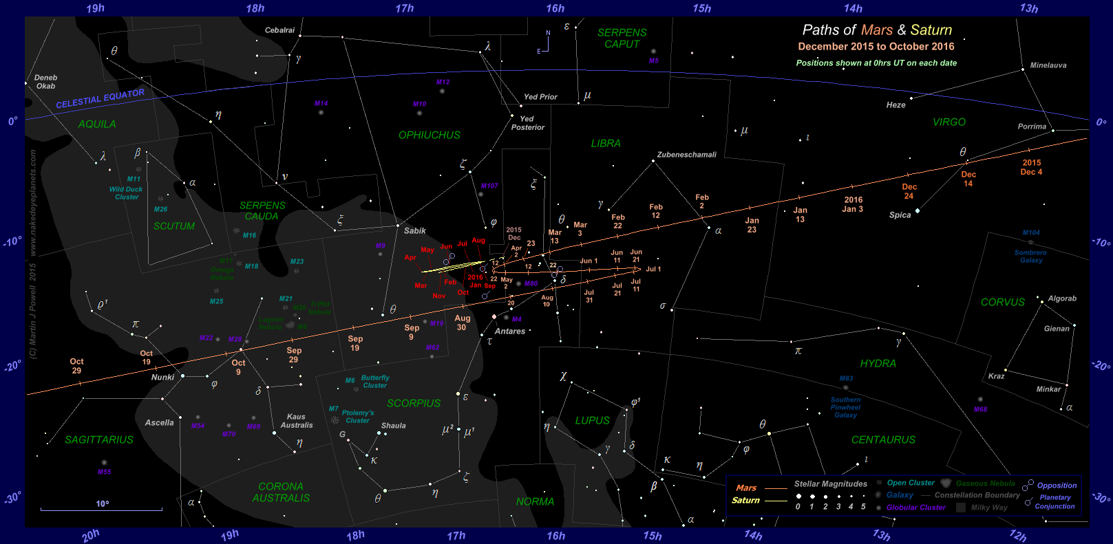 The path of Mars against the background stars of the Southern zodiac from December 2015 to October 2016, shown at 10-day intervals (click on the thumbnail for the full-size image). During this apparition Mars described a Southward zig-zag formation against the background stars, unlike the 'hybrid' loop that it described during the planet's previous apparition in 2013-15. The path of Saturn in Southern Ophiuchus is also marked at the beginning of each month over the same period; the two planets passed each other in the evening sky in late August 2016 (for more details see the planetary conjunctions section below). The star map applies to observers in the Northern hemisphere (i.e. North is up); for the Southern hemisphere view, click here. The faintest stars shown on the map have an apparent magnitude of about +4.8. Printer-friendly versions of this chart are available for Northern and Southern hemisphere views. Astronomical co-ordinates of Right Ascension (longitude, measured Eastwards in hrs:mins from the First Point of Aries) and Declination (latitude, measured in degrees North or South of the celestial equator) are marked around the border of the chart. Click here to see a 'clean' star map of the area (i.e. without planet path); observers may wish to use the 'clean' star map as an aid to plotting the planet's position on a specific night - in which case, a printable version can be found here. Night sky photographs of the Southern zodiac constellations can be seen below. |