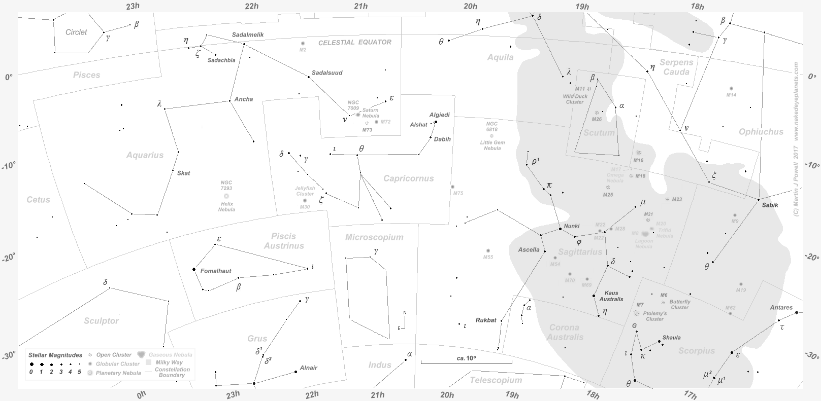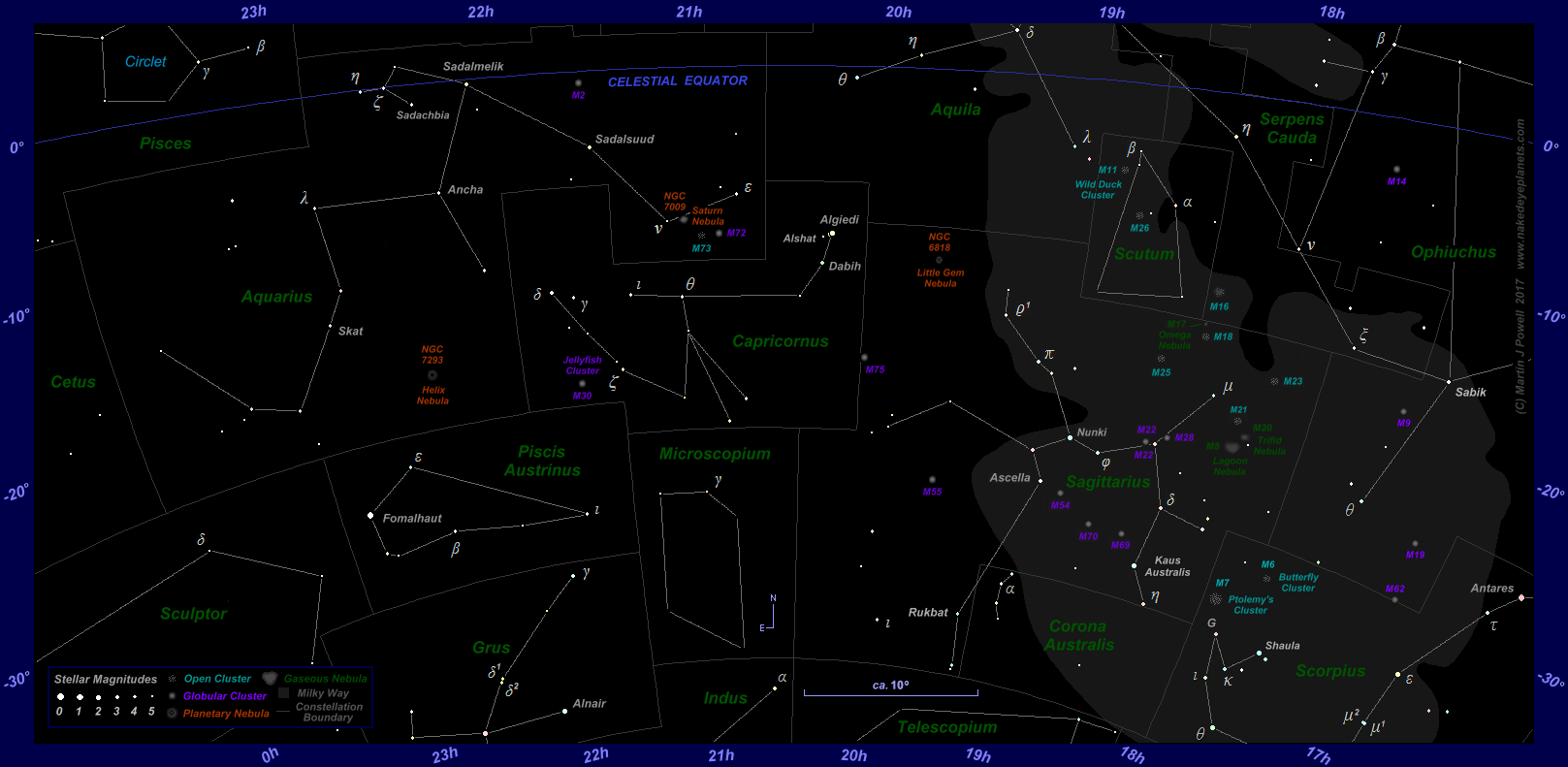 Mars' passage through the constellations during the latter (i.e. post star chart) period of the 2017-19 apparition is summarised in the table below:
