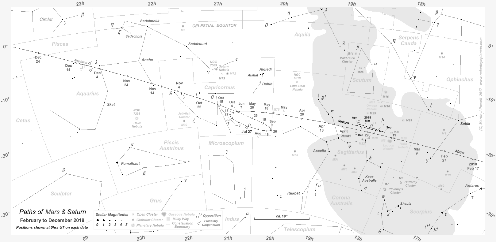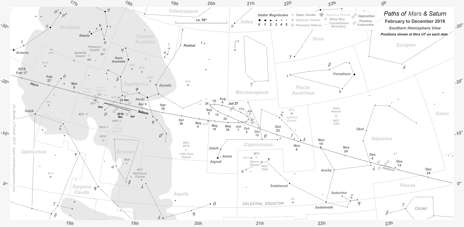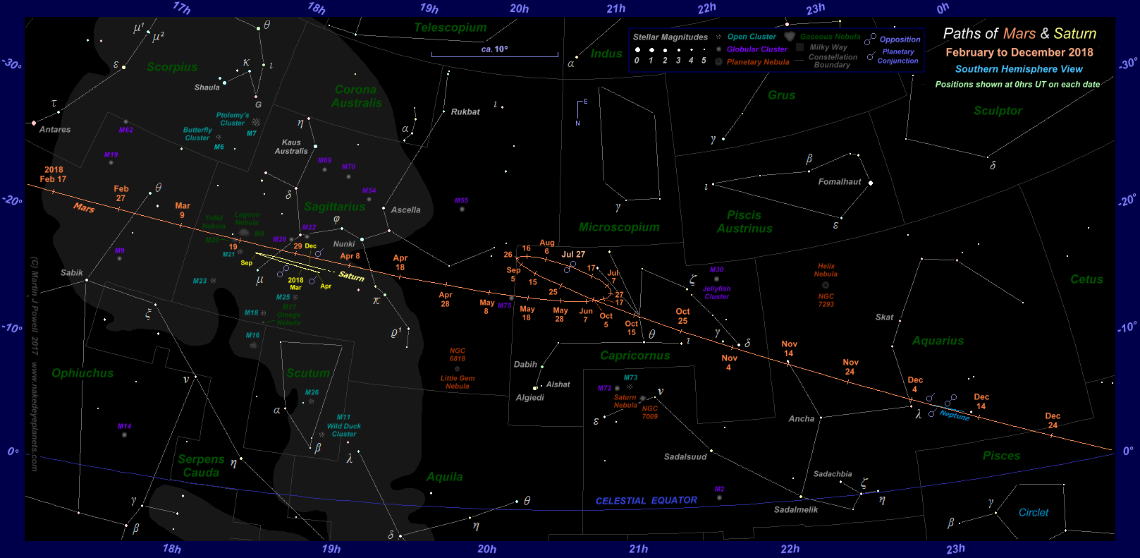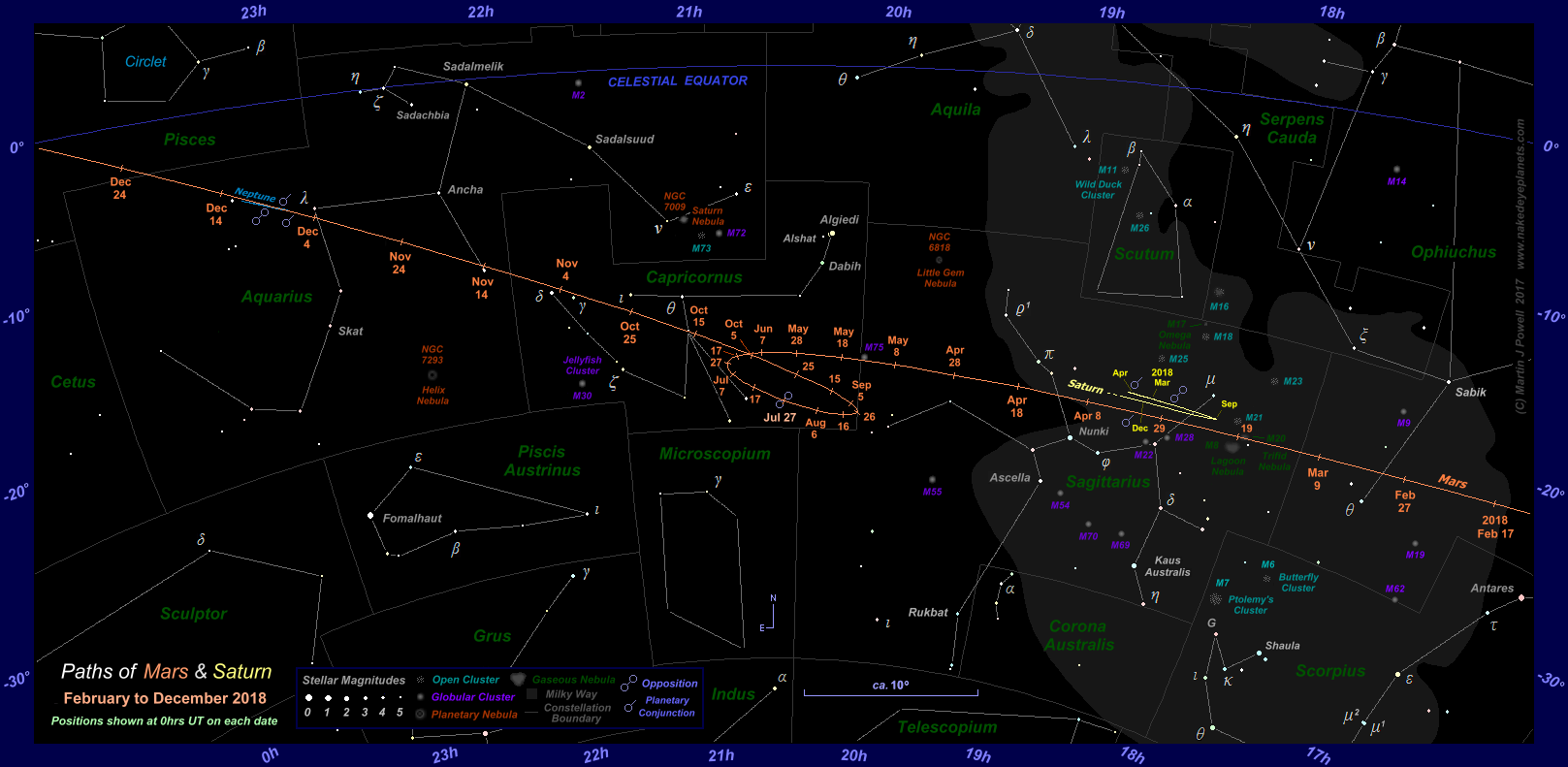 The path of Mars against the background stars from February to December 2018, shown at 10-day intervals (click on the thumbnail for the full-size image). During this apparition Mars described a Southward-facing loop against the background stars, quite unlike the 'zig-zag' that it described during the planet's previous apparition in 2015-17. The path of Saturn in Sagittarius is also shown, marked at the beginning of selected months over the same period; the two planets passed each other in the morning sky in early April 2018 (for more details see the planetary conjunctions section below). The star map applies to observers in the Northern hemisphere (i.e. North is up); for the Southern hemisphere view, click here. The faintest stars shown on the map have an apparent magnitude of about +4.8. Printer-friendly versions of this chart are available for Northern and Southern hemisphere views. Astronomical co-ordinates of Right Ascension (longitude, measured Eastwards in hrs:mins from the First Point of Aries) and Declination (latitude, measured in degrees North or South of the celestial equator) are marked around the border of the chart. Click here to see a 'clean' star map of the area (i.e. without planet path); a printable version can be found here. Photographs of this region of the night sky can be seen below. |