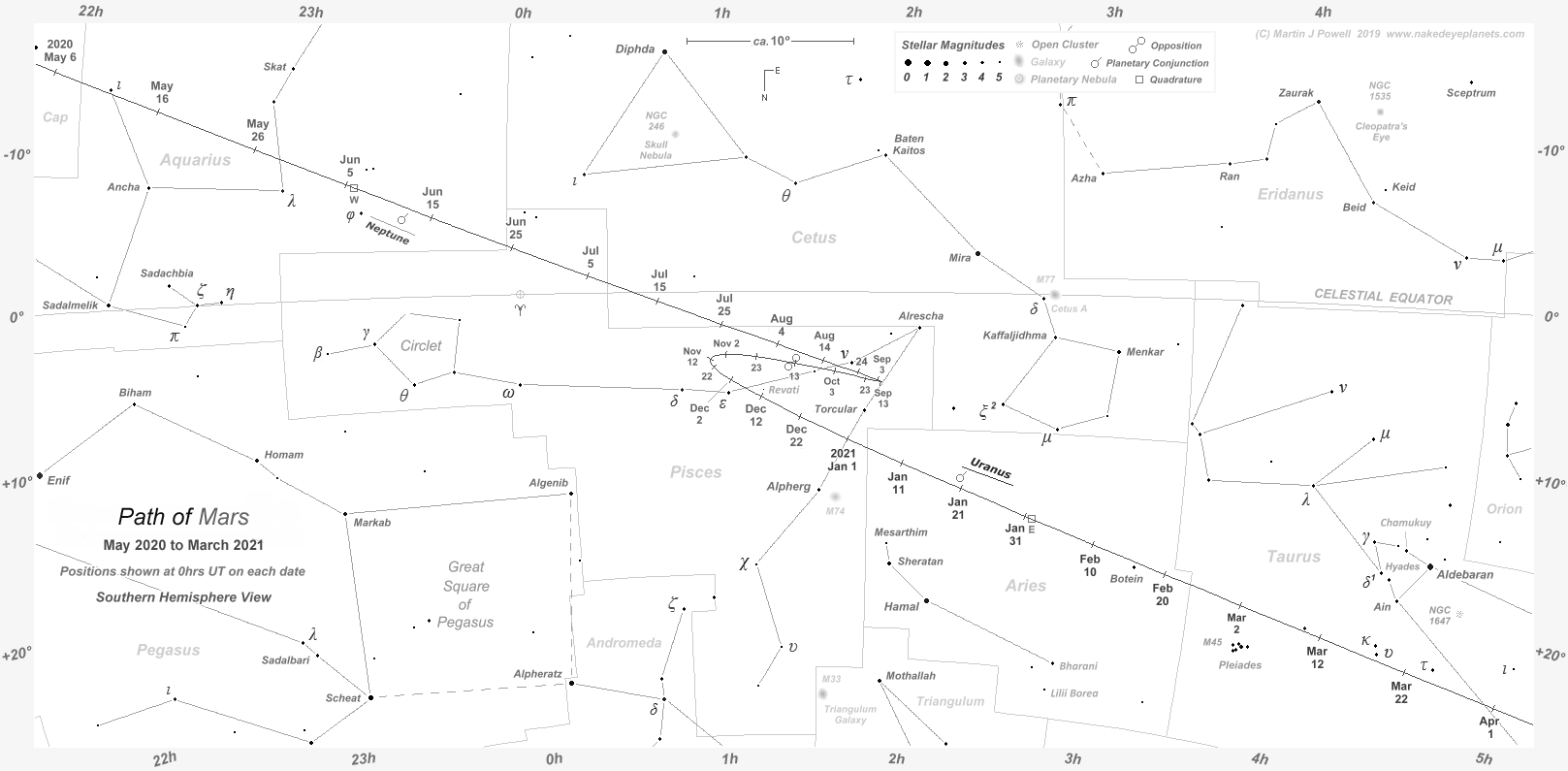 The morning conjunction between Mars and Neptune on June 12th 2020 was ideally placed for Southern hemisphere observers, the two planets being positioned in North-eastern Aquarius. At magnitude +7.9, Neptune was only 0.1 magnitude below its peak brightness for the year. Mars, at magnitude -0.2, shone brighter than at any of the other five planetary conjunctions of the period. By the time Neptune disappeared from view in the dawn twilight, the pair were placed 19° high in the South-east at 50° North, 45° high in the South-east at 30° North and 78° high in the ESE at at the Equator. In the Southern hemisphere they stood 79° high in the NNE when Neptune disappeared from view at 15° South, 60° high in the North at 35° South and 49° high in the NNW at 45° South. Telescopically Mars appeared 4½ times larger than Neptune and shone over 1700 times brighter! However any glare caused by the Red Planet's brightness was alleviated by the aforementioned wide separation between the pair.