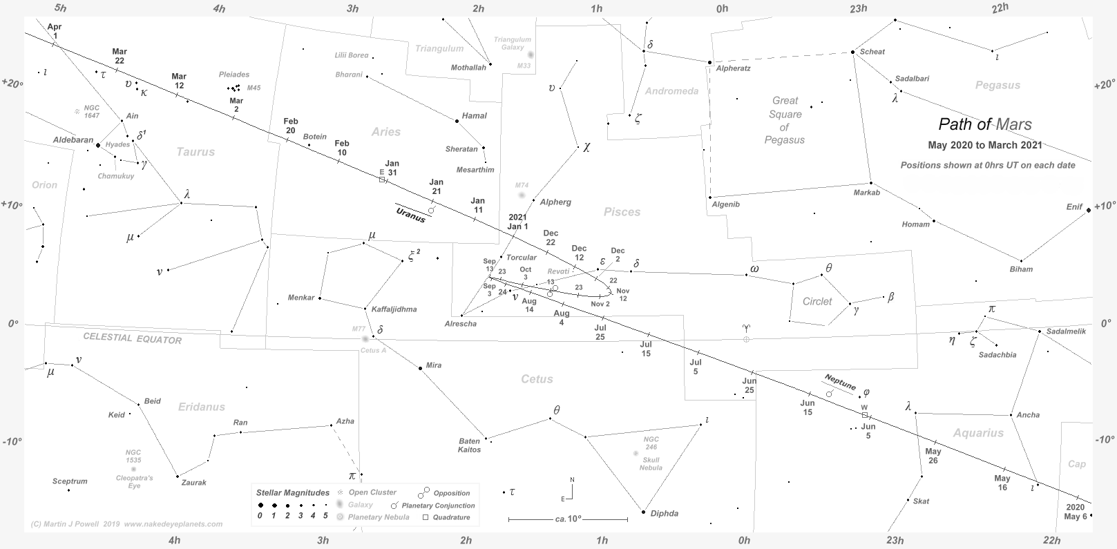 Both conjunctions of Mars with the outer planets Uranus and Neptune took place at wide solar elongations (95° and 92° respectively), both events having the same planetary separations (1°.7). The evening conjunction between Mars and Uranus of January 21st 2021 took place in Aries and was visible worldwide; it also had the widest solar elongation of the six conjunctions. It was the only conjunction of the 2019-21 apparition which favoured Northern hemisphere observers. As Uranus came into view in the dusk twilight the two planets were positioned 42° in altitude towards the SSE at latitude 60° North, 64° in the South at latitude 40° North, 83° in the SSW at 20° North and 73° in the NNW at the Equator. In the Southern hemisphere the altitudes and directions were as follows: 46° high in the NNW at 25° South, 35° high in the NNW at 35° South and 22° high in the North-west at 45° South. At the moment of conjunction Uranus was 18 times further away than Mars and through telescopes it appeared less than half the apparent disk size of the Red Planet.