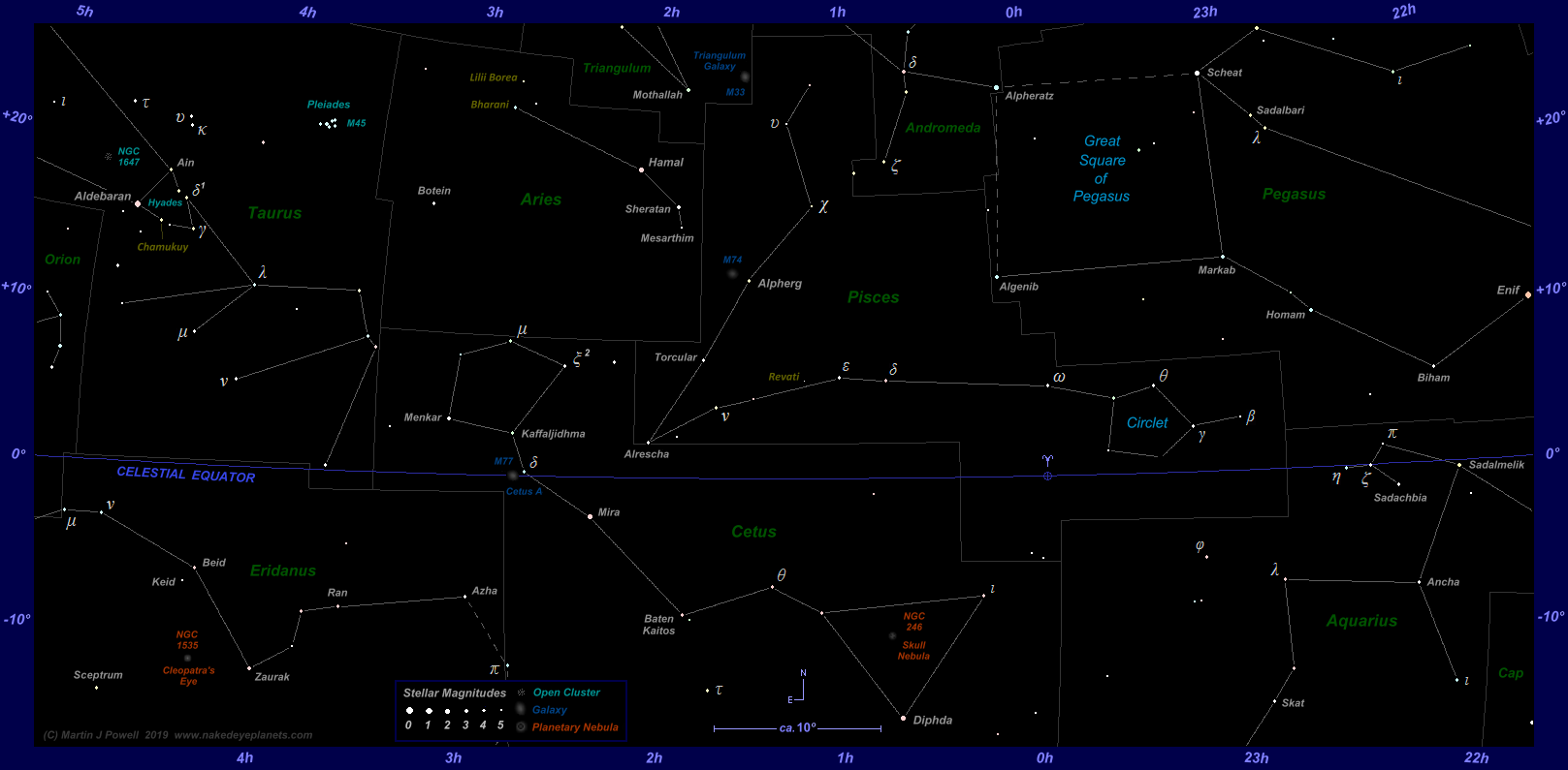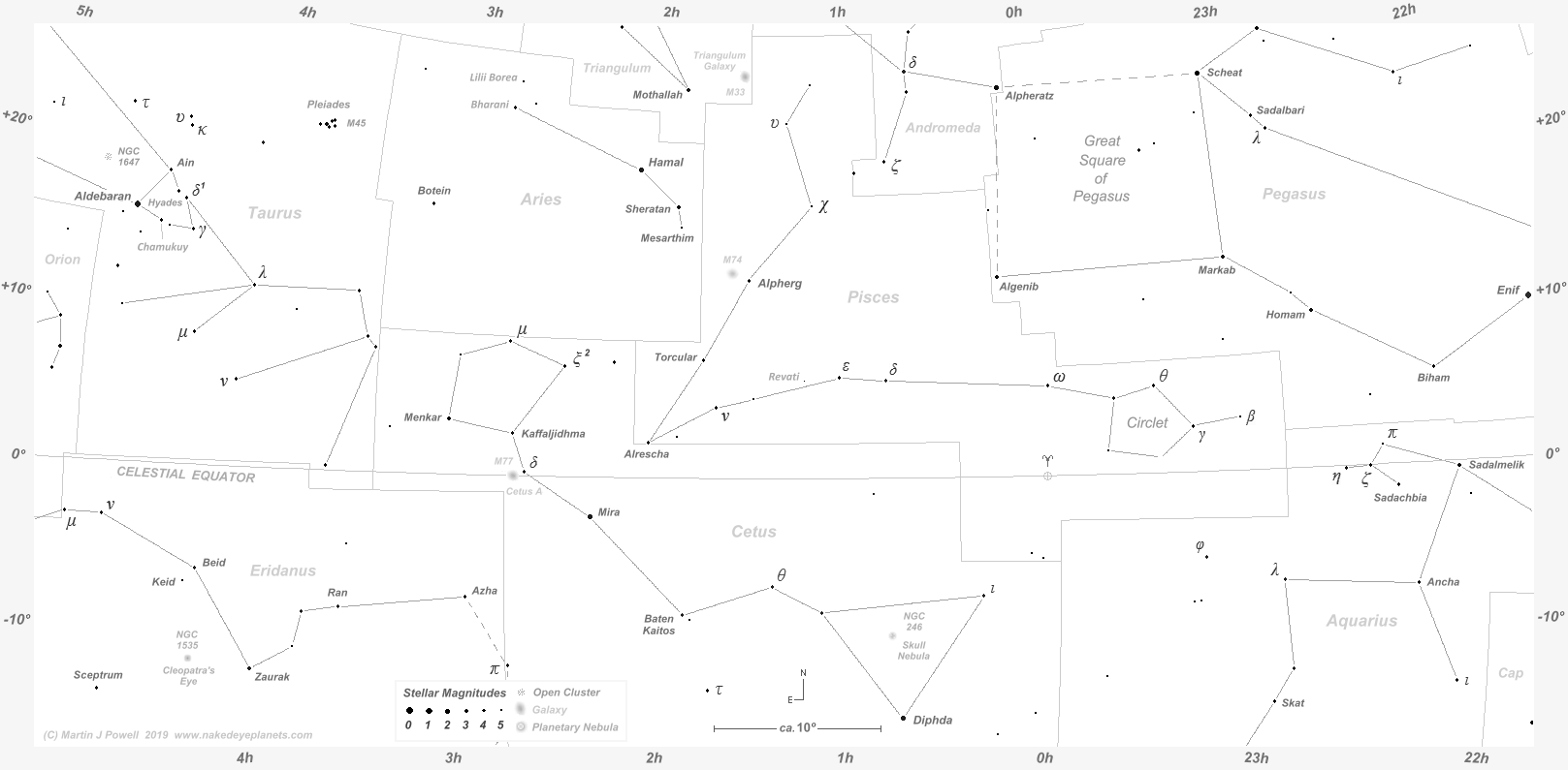 (marked on the chart by the symbol The star map applies to observers in the Northern hemisphere (i.e. North is up); for the Southern hemisphere view, click here. The faintest stars shown on the map have an apparent magnitude of about +4.8. Printer-friendly versions of this chart are available for Northern and Southern hemisphere views. Astronomical co-ordinates of Right Ascension (longitude, measured Eastwards in hrs:mins from the First Point of Aries) and Declination (latitude, measured in degrees North or South of the celestial equator) are marked around the border of the chart. Click here to see a 'clean' star map of the area (i.e. without planet paths); a printable version can be found here. Photographs of this region of the night sky can be seen below. The four star names shown in yellow-green were officially adopted by the International Astronomical Union (IAU) in 2017. |