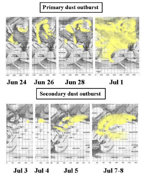 | Left: Table showing the planet-encircling Martian Dust Storms which have been observed since 1909. Data from McKim (2008 and 2009). |