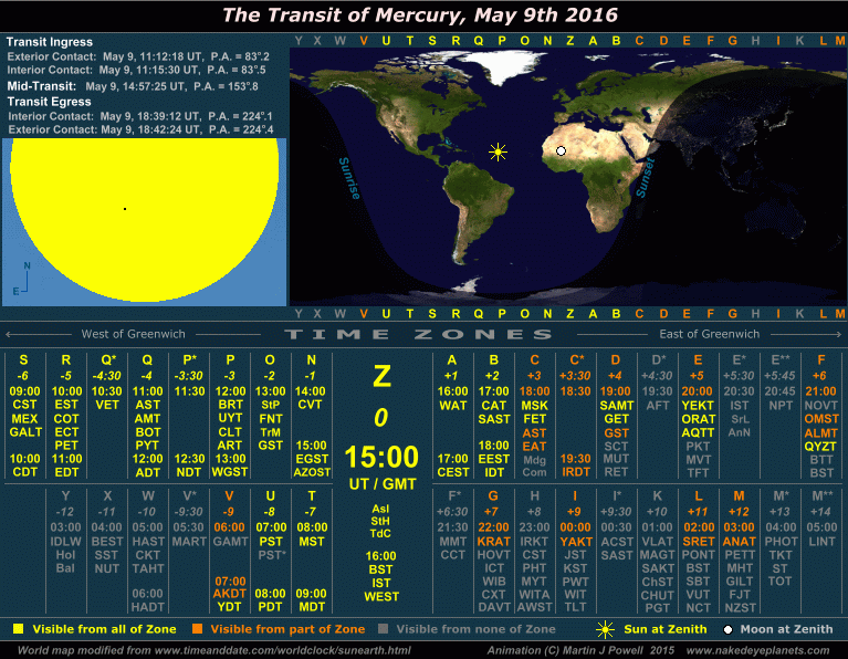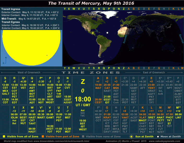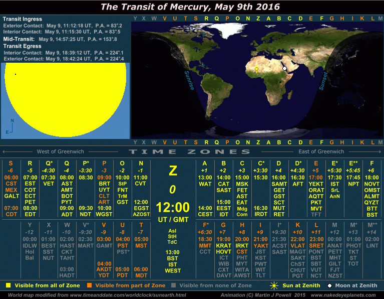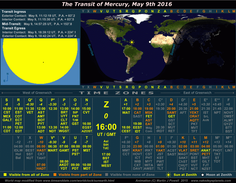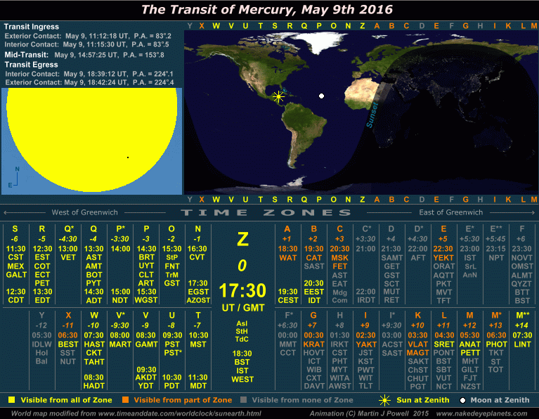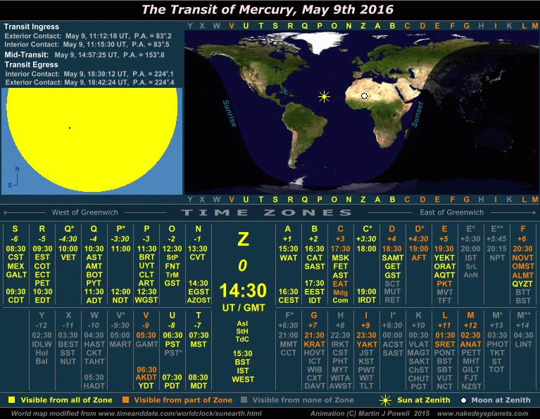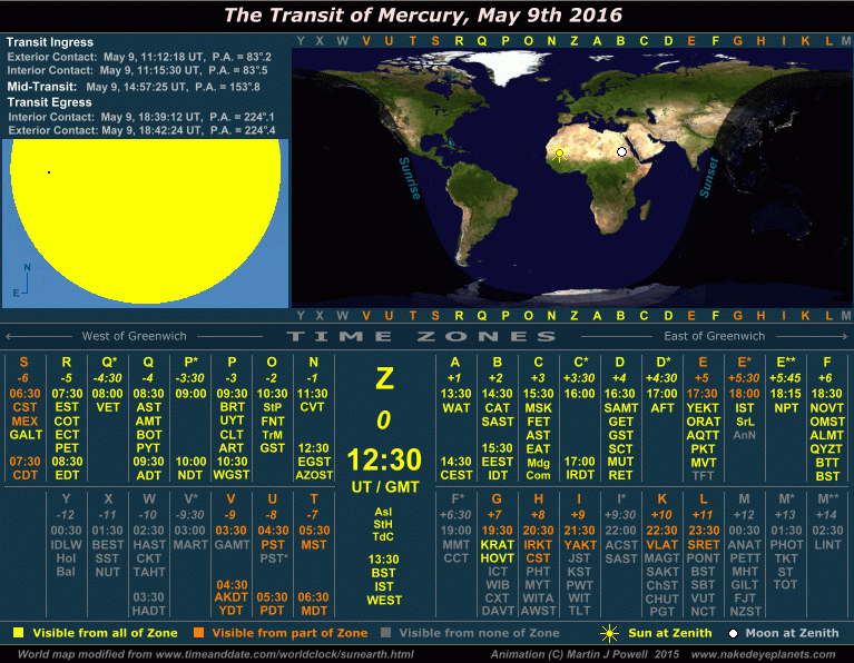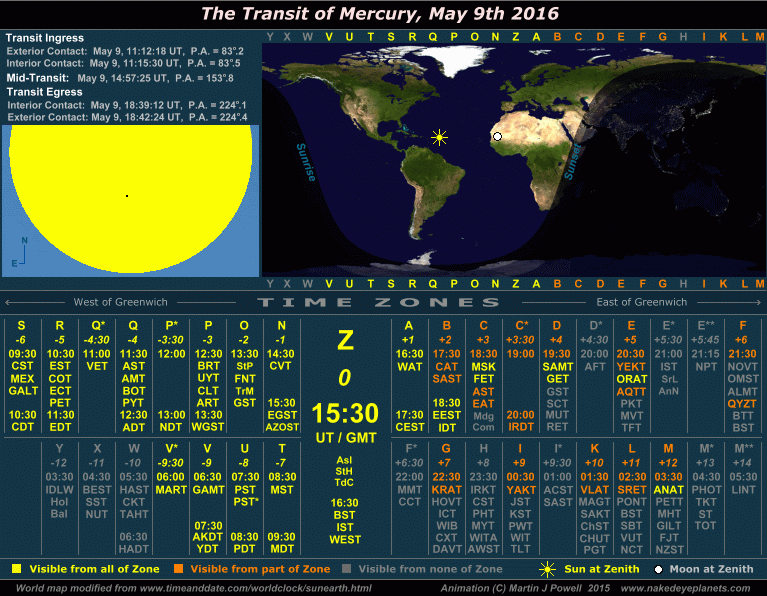 The Transit of Mercury, May 9th 2016 Time/visibility map showing the local times and world visibility of the whole event (click on the buttons to view each frame). The world map shows the regions of the world from which the transit was visible. In the lower half of the graphic, the time zones show the local times at which the event took place, listed by their military and local time zone designations. To determine the time zone in which you are situated, locate your Standard Time offset from Greenwich (hours East or West of Greenwich) shown in italics beneath each zone letter (alternatively, refer to the world map at WorldTimeZone.com). For example, the standard time at Los Angeles, USA is 8 hours behind Greenwich, so the relevant times will be found in the '-8 ' time zone, i.e. zone U ('Uniform'). For more details on how to use the time/visibility map for your own time zone, refer to the main text below. |