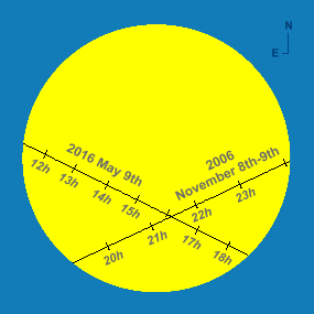 Tracks of Mercury across the solar disk in 2006 and 2016. To see the timings of each event, move your pointing device over the image (or click on it). Times are shown at hourly intervals in Universal Time (UT), which is equivalent to GMT. |