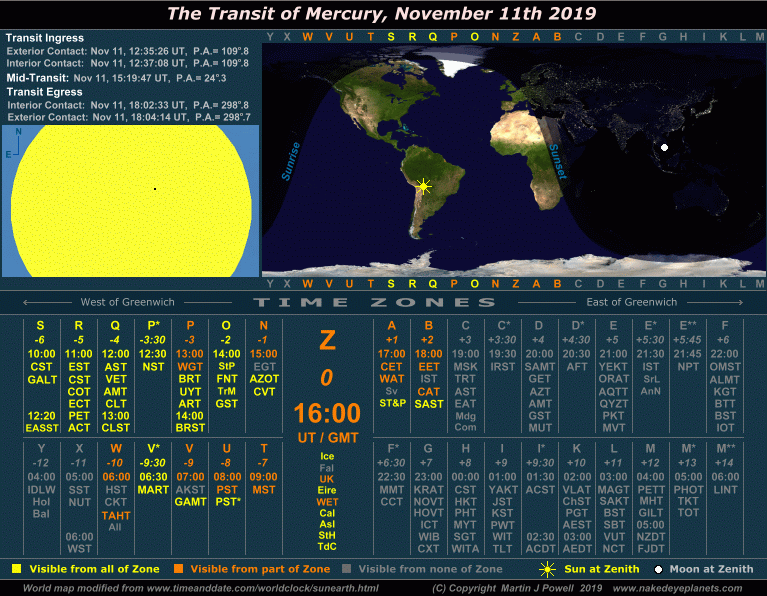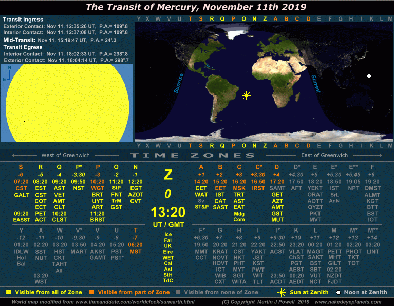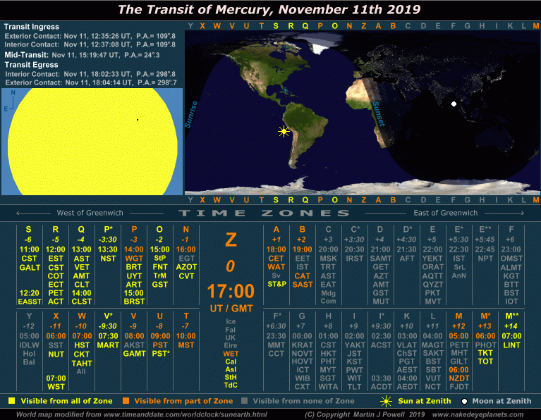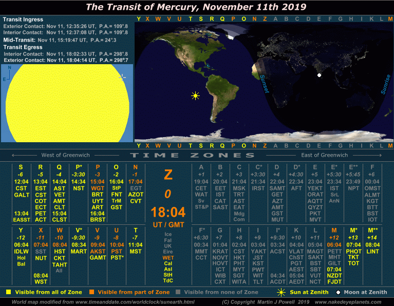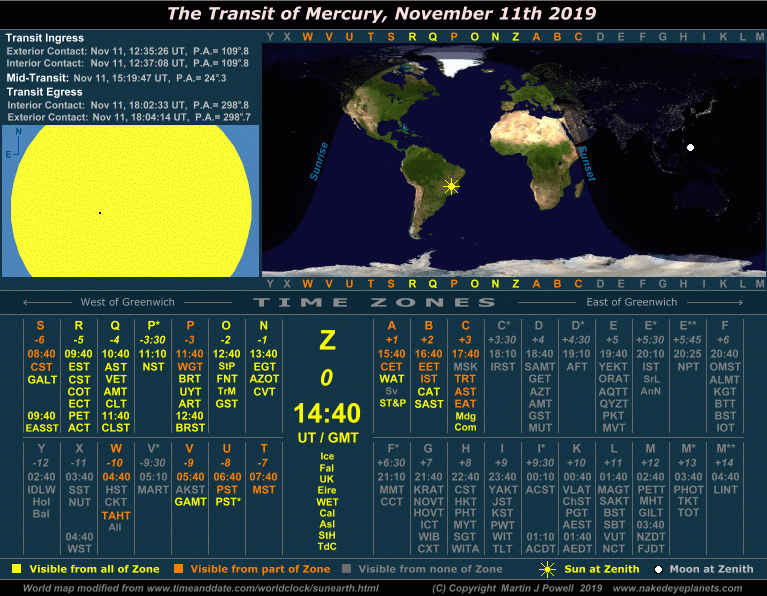 The Transit of Mercury, November 11th 2019 Time/visibility map showing the local times and world visibility of the whole event (click on the buttons to view each frame). The world map shows the regions of the world from which the transit was visible. In the lower half of the graphic, the time zones show the local times at which the event took place, listed by their military and local time zone designations (click here for a legend of the local time zone abbreviations and island designations within each time zone). To determine the time zone in which you are situated, locate your Standard Time offset from Greenwich (hours East or West of Greenwich) shown in italics beneath each zone letter (alternatively, refer to the world map at TimeandDate.com). For example, the standard time at Los Angeles, USA is 8 hours behind Greenwich, so the relevant times will be found in the '-8 ' zone, i.e. time zone U ('Uniform'). For more details on how to use the time/visibility map for your own time zone, refer to the main text below. |