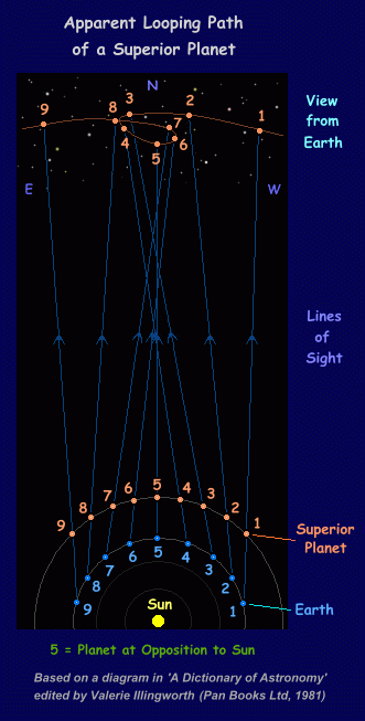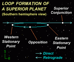 During the course of the year, all the planets appear to describe intricate 'loop formations' against the background stars; this is a line-of-sight effect caused by the changing relative positions of the Earth and the planets as they move at differing speeds in their orbits. During a loop formation, the planets are seen to move direct or prograde (from West to East) and retrograde (from East to West, or 'backwards') with short periods in between when they appear stationary. A superior planet is seen to move retrograde because the Earth, being closer to the Sun and moving at a faster orbital speed, effectively 'overtakes' the superior planet, the result being that the planet appears to move backwards against the distant star background (although of course, both planets are moving in the same direction). The situation can be likened to two cars travelling in the same direction along a highway, the faster car (i.e. the Earth) overtaking the slower car (i.e. the planet). A passenger seated in the faster car sees the slower car move 'backwards' in relation to its background - although of course, both cars are moving in the same direction.
