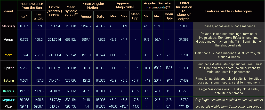 Selected Orbital and Observational Data for the Major Planets