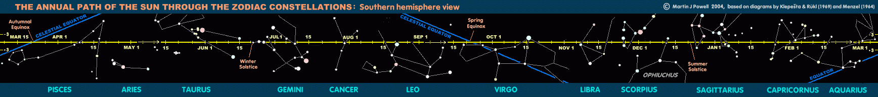 The Sun's Annual Motion through the Zodiac Constellations (click on the image for a full-size zodiac strip). The Sun's position is shown at five day intervals along the ecliptic;, shown here referred to the plane of the ecliptic (i.e. it appears as a straight line). The points of the solstices and the equinoxes (for the Northern hemisphere) are also marked. The Sun moves Eastwards through the zodiac constellations at a rate of just under 1º per day (although of course it is the Earth's own motion through its orbit - and not the Sun - which causes this apparent motion). The Sun's exact position on a particular day over any given four-year period can vary by up to 0º.75 because of the inexact number of days in the Earth's year; this is of course corrected - at four yearly intervals - by the insertion of a leap day at the end of February. Most of the time, the planets will be found within a band about 3º above and below the ecliptic (marked at both ends of the zodiac strip with +3 and -3). A Southern hemisphere view of the zodiac, showing the antipodean solstice and equinox points, can be seen here. |