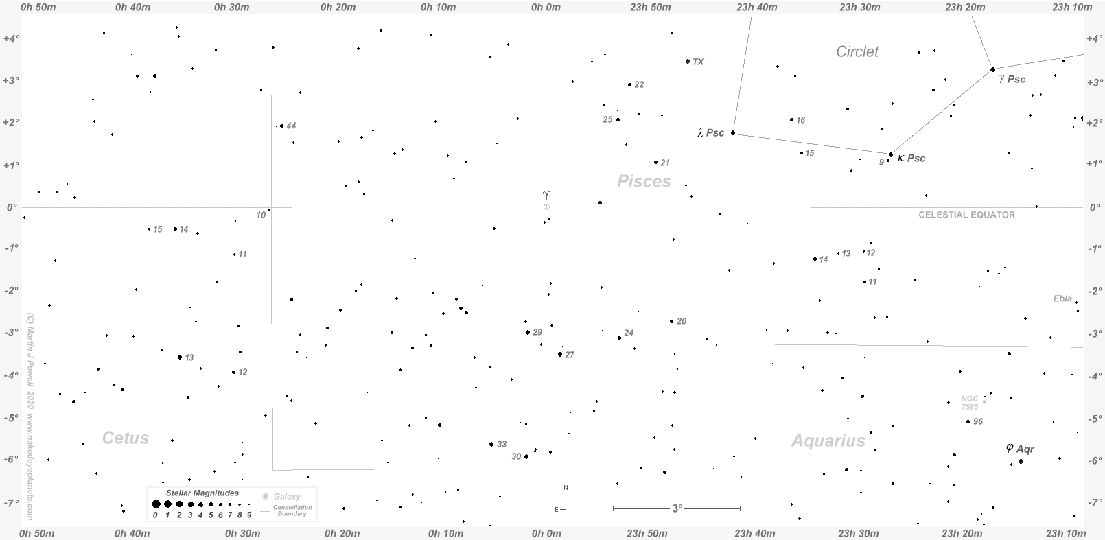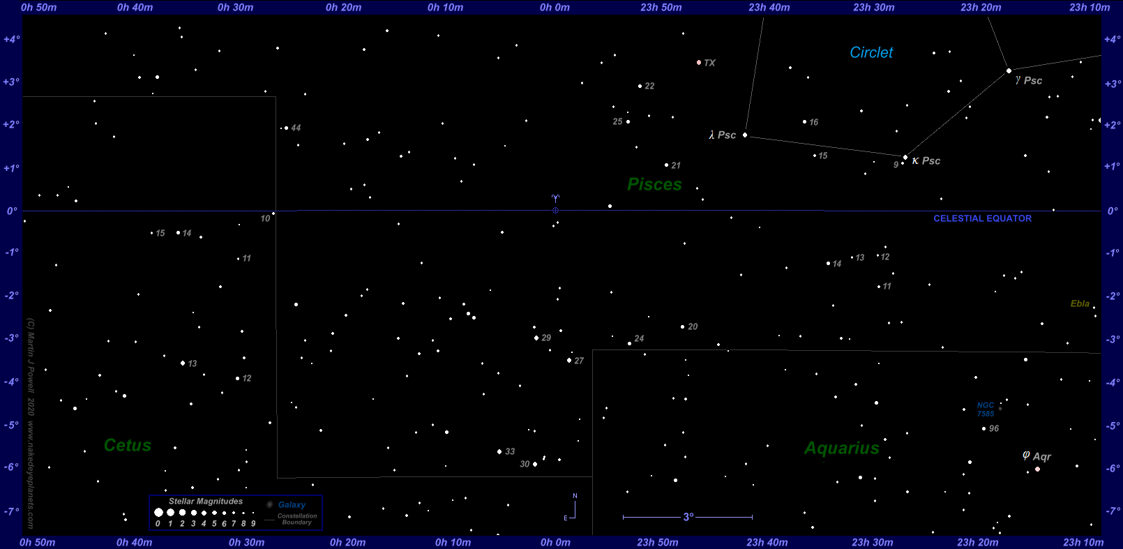 Neptune entered the constellation of Pisces, the Fishes, in early May 2022, where it will be mostly positioned through to May 2039. During this 17-year period Neptune retrogrades back into Aquarius, the Water Carrier, in August 2022 and November 2023 (in the latter case for just ten days). The planet crosses the celestial equator (where the declination of a celestial body is 0°) in Pisces in April 2026 (heading North-eastwards and moving direct), in September 2026 (heading South-westwards and moving retrograde) and again in February 2027 (resuming North-easterly motion, moving direct).