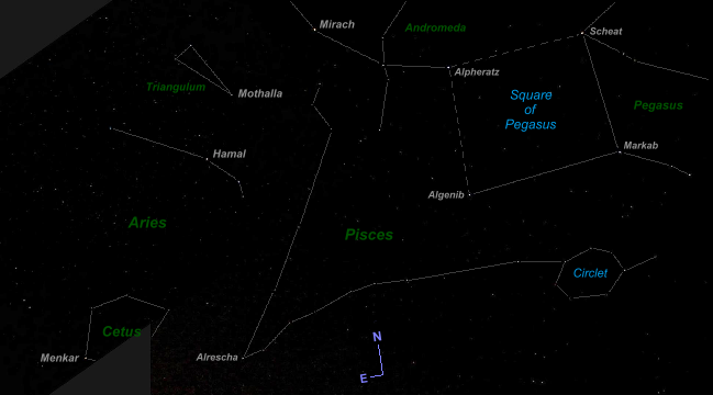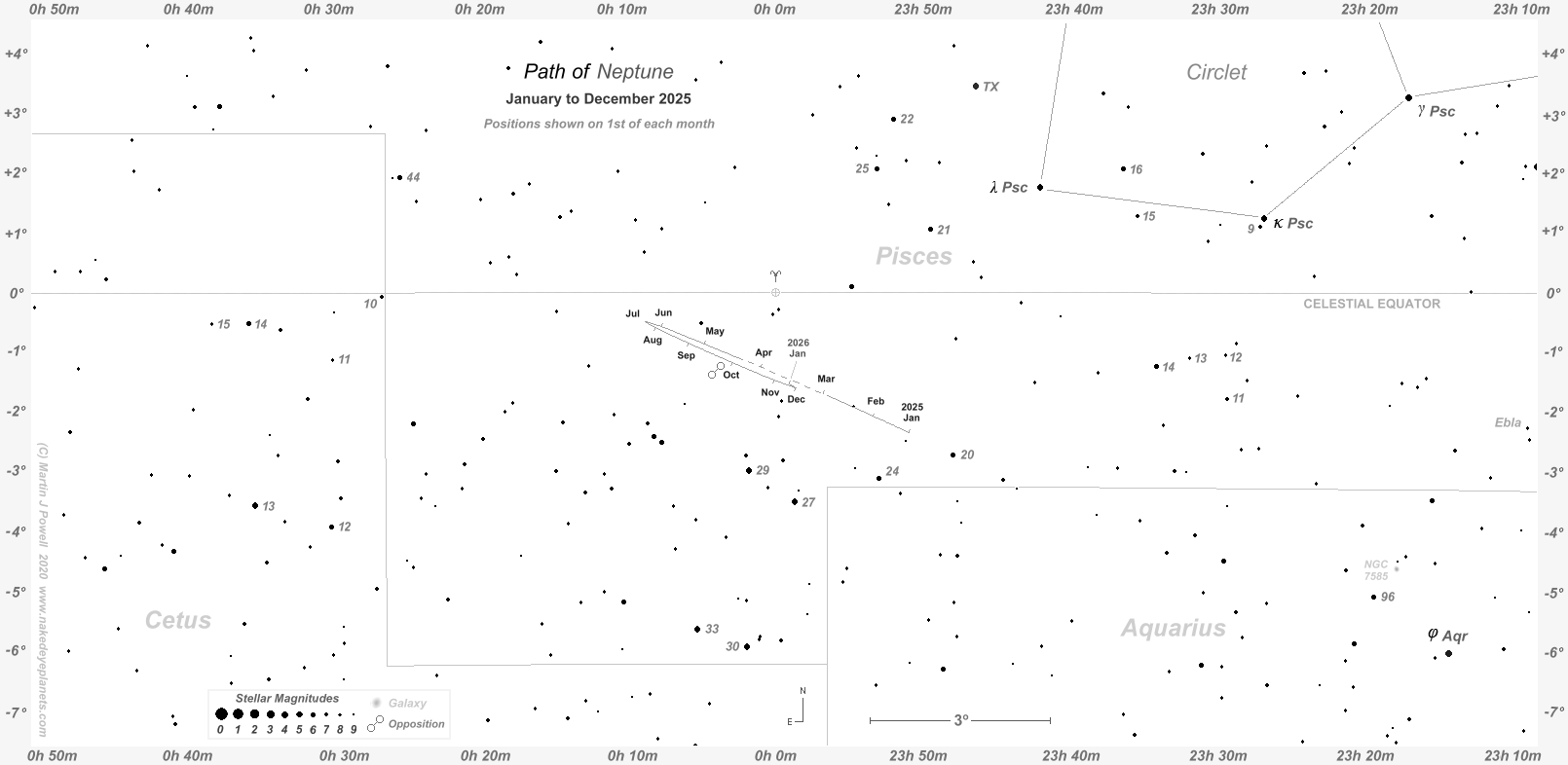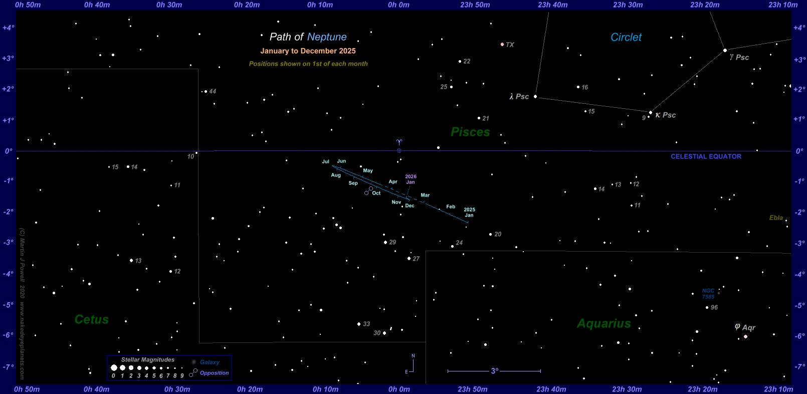 During 2025 Neptune was positioned in South-western Pisces, close to its border with Aquarius, the Water Carrier. It reached opposition in September, several degrees South-east of the Circlet of Pisces asterism.