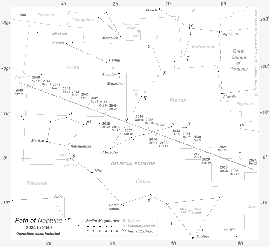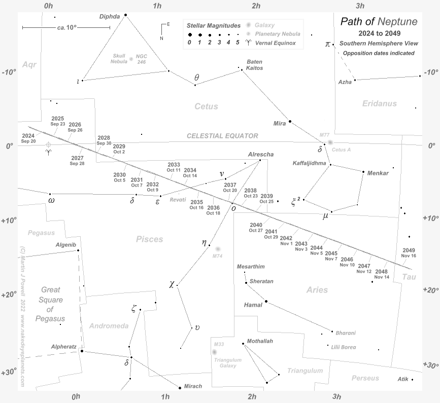 Star map showing the path of Neptune against the background stars of Pisces, Cetus and Aries from 2024 to 2049. Positions are marked for each opposition date. Neptune describes South-facing loops throughout the period, although the individual 'loops' are not discernible in this chart because of its small scale (each loop appears as an oblique line). Because the angular width of Neptune's loops (about 2º.8 across) are greater than its annual orbital motion against the background stars, each successive loop overlaps (in longitude) with the next. The star map applies to observers in the Northern hemisphere (i.e. North is up); for the Southern hemisphere view, click here. The faintest stars shown on the map have an apparent magnitude of about +4.8. Printer-friendly versions of this chart are available for Northern and Southern hemisphere views. Astronomical co-ordinates of Right Ascension (longitude, measured Eastwards in hrs:mins from the First Point of Aries) and Declination (latitude, measured in degrees North or South of the celestial equator) are marked around the border of the chart. |
