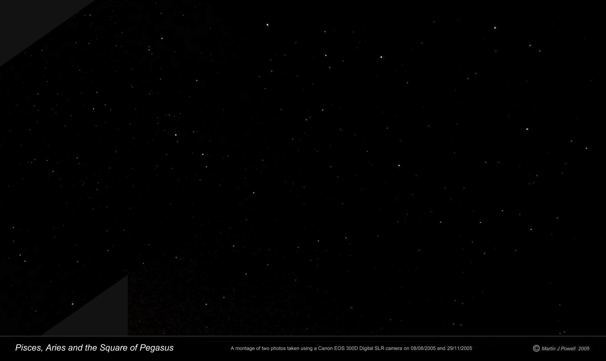 Pisces and Aries A montage of two photographs showing the region of the night sky through which Neptune passes through to 2050. Stars can be seen down to about magnitude +7 (move your pointer over the image - or click here - to see an annotated version of the photograph and click on the thumbnail to see the full-size picture) |