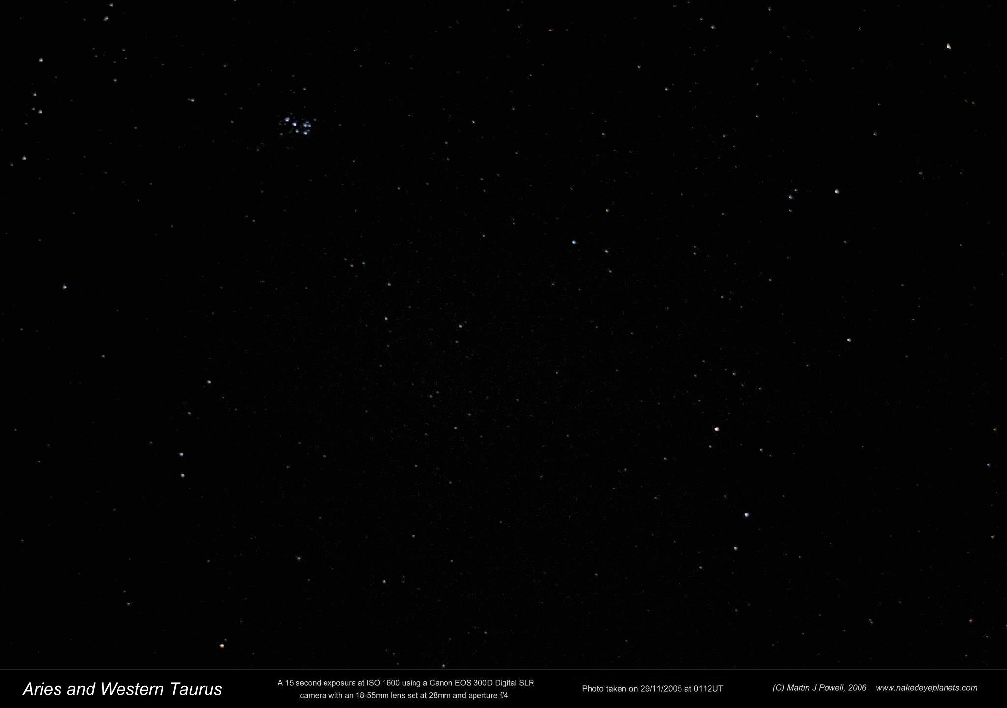 Aries and Taurus Photographs showing the region of the night sky through which Uranus passes from 2019 to the early 2030s. In the Aries & Western Taurus photo, stars can be seen down to about magnitude +7.5. In the Taurus photo, the limiting magnitude is about +8 (click on the thumbnails to see the full-size picture) |