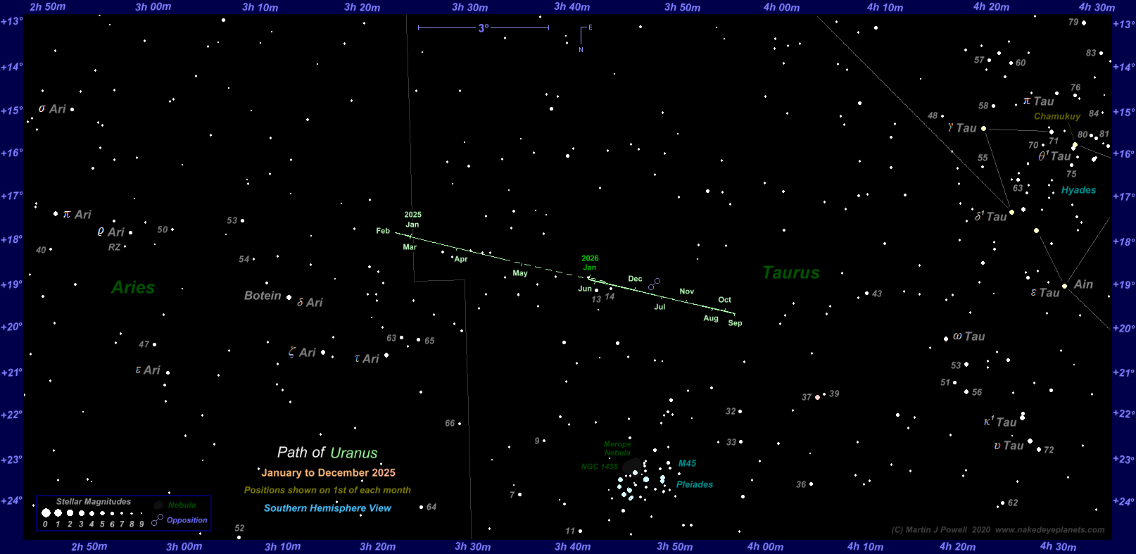 During most of 2025 Uranus can be found just inside the western border of Taurus, the Bull. It reaches opposition in November, positioned about 4° South of the Pleiades (M45) star cluster.