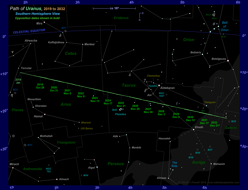 Star map showing the path of Uranus against the background stars of Aries and Taurus from 2019 to 2032, with the position of each opposition date marked. From 2019 through 2022 Uranus describes a series of shallow, Southward-facing loops because the planet is then South of the ecliptic (the individual loops are about 4º wide and are not discernible in this map because of its small scale). From 2023 through 2025 Uranus describes hybrid loops (half loop, half zig-zag) followed by zig-zag formations from 2026 to 2030, the planet crossing to the North of the ecliptic in mid-2029. Uranus then returns to hybrid loops from 2031 through to the end of the period. The star map applies to observers in the Northern hemisphere (i.e. North is up); for the Southern hemisphere view, click here. The faintest stars shown on the map have an apparent magnitude of about +4.8. Printer-friendly versions of this chart are available for Northern and Southern hemisphere views. Astronomical co-ordinates of Right Ascension (longitude, measured Eastwards in hrs:mins from the First Point of Aries) and Declination (latitude, measured in degrees North or South of the celestial equator) are marked around the border of the chart. Star names shown in yellow-green were officially adopted by the International Astronomical Union (IAU) in 2017. Three of the four such star names shown on this chart were drawn from Chinese, Hindu and Mayan mythology (for more details see the IAU's Working Group on Star Names pages). The above chart will help in finding the general location of the planet throughout the period in question, however a detailed finder chart will be required to pinpoint the planet precisely - of which, see below. |