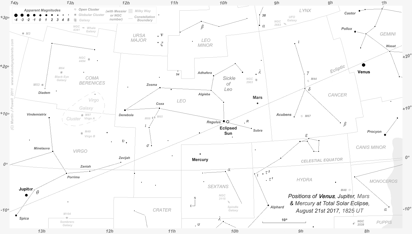 On August 21st 2017 millions of observers looked skywards to witness the first total solar eclipse over the USA mainland since 1979. The 'Great American Eclipse', visible from twelve states across the country from North-west to South-east, was the most photographed, filmed and talked-about solar eclipse in history. This article does not examine the eclipse itself, however, but the naked-eye planets which one could have expected to glimpse in the vicinity of the eclipsed Sun (and a little further afield) within the 2½ minutes or so of totality. A total solar eclipse is the only circumstance in which planets positioned on either side of the Sun (morning and evening planets) can be observed from Earth at the same time.