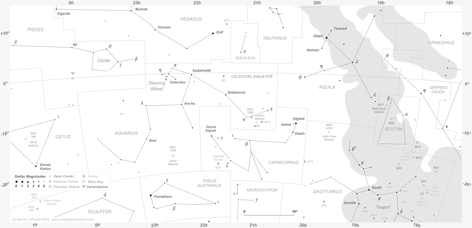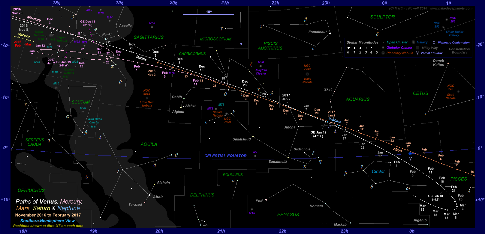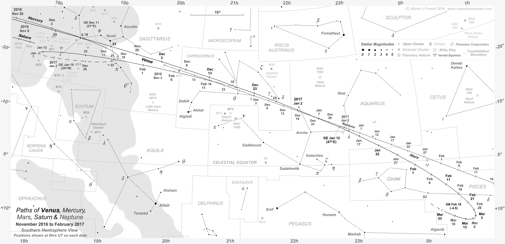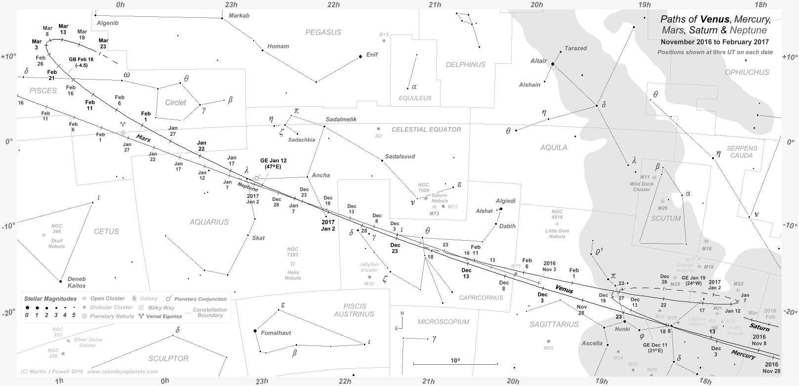The paths of Venus, Mercury, Mars and Saturn through the zodiac constellations during the latter part of Venus' evening apparition in 2016-17 (click on the thumbnail for the full-size image). The earlier part of the planets' apparition is shown in the chart below. Positions for Venus, Mercury and Mars are plotted for 0 hrs Universal Time (UT) at 5-day intervals, while Saturn's position is plotted on the 1st day of each month. The path of Neptune is also shown for reference. Both evening and morning apparitions of Mercury are included. Wherever a planet was too close to the Sun to view, the path is shown by a dashed line (- -). Hence Mercury's evening apparition ended around mid-December 2016 when it became lost from view in the dusk twilight. The planet was then unobservable for about two weeks before it re-emerged in the morning sky in early January 2017. Because Mercury is mostly seen under twilit conditions, many of the fainter stars shown in the planet's vicinity may not have been visible when the planet itself was observed. For Venus, apparition data for the dates shown in bright white (at 10-day intervals) are included in the table below. The positions at which Venus and Mercury attained greatest elongation from the Sun are indicated by the letters 'GE', with the solar elongation angle in brackets. Eastern elongations apply for evening apparitions and Western elongations for morning apparitions (the elongation of Venus is Easterly throughout the chart coverage). The position at which Venus attained greatest brilliancy for this apparition (apparent magnitude = -4.5) is shown by the letters 'GB'. Note that both evening and morning apparitions of Mercury shown on the chart favoured Southern hemisphere observers (who should refer to the Southern hemisphere chart for a more appropriate orientation). The faintest stars shown have an apparent magnitude of about +4.8. Printer-friendly versions of this chart are available for Northern and Southern hemisphere views. Astronomical co-ordinates of Right Ascension (longitude, measured Eastwards in hrs:mins) and Declination (latitude, measured in degrees North or South of the celestial equator) are marked around the border of the chart. Click here to see a 'clean' star map of the area (i.e. without planet paths); a printable version can be found here. A