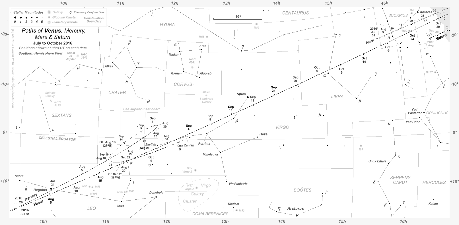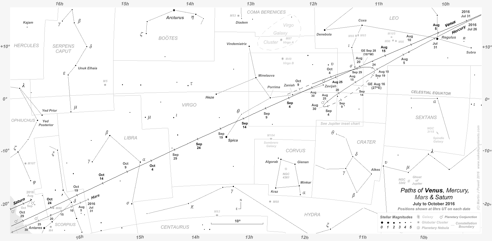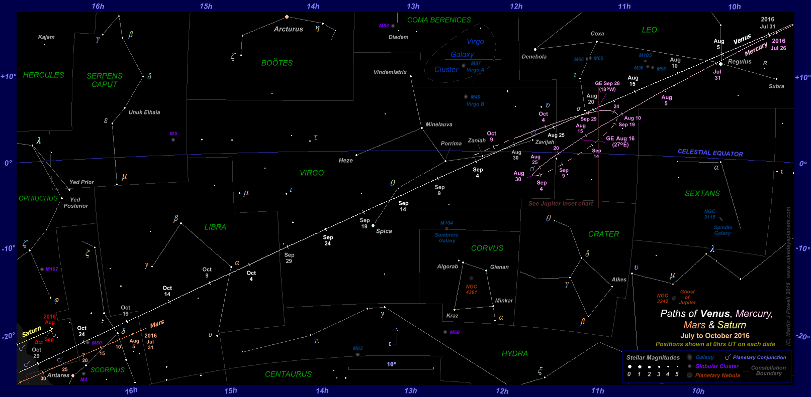 Over a period of a month commencing August 4th, Venus, Mercury and Jupiter formed an interesting planetary grouping on the Leo-Virgo border, with the waxing crescent Moon joining the group from August 4th-6th. Jupiter, at magnitude -1.7, was now in the closing stage of its 2015-16 apparition, having spent most of the period in South-eastern Leo. Mercury was undergoing the second evening apparition of the year, there having been six full apparitions during 2016 (three in the morning and three in the evening).