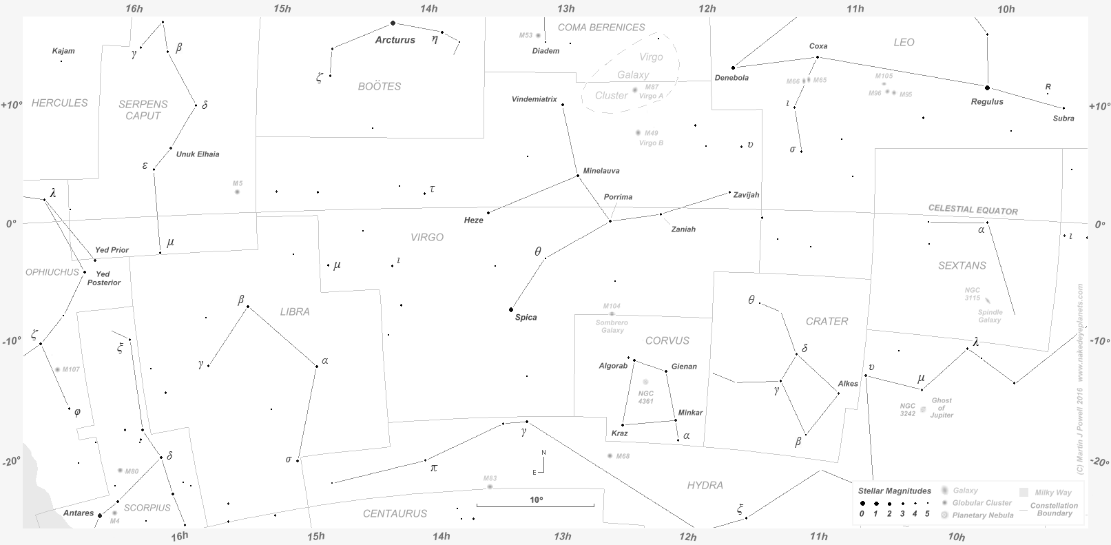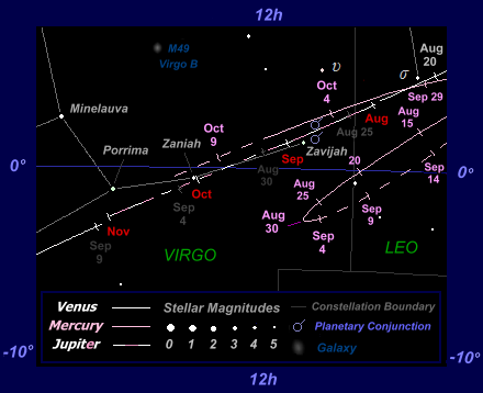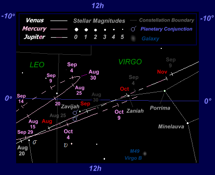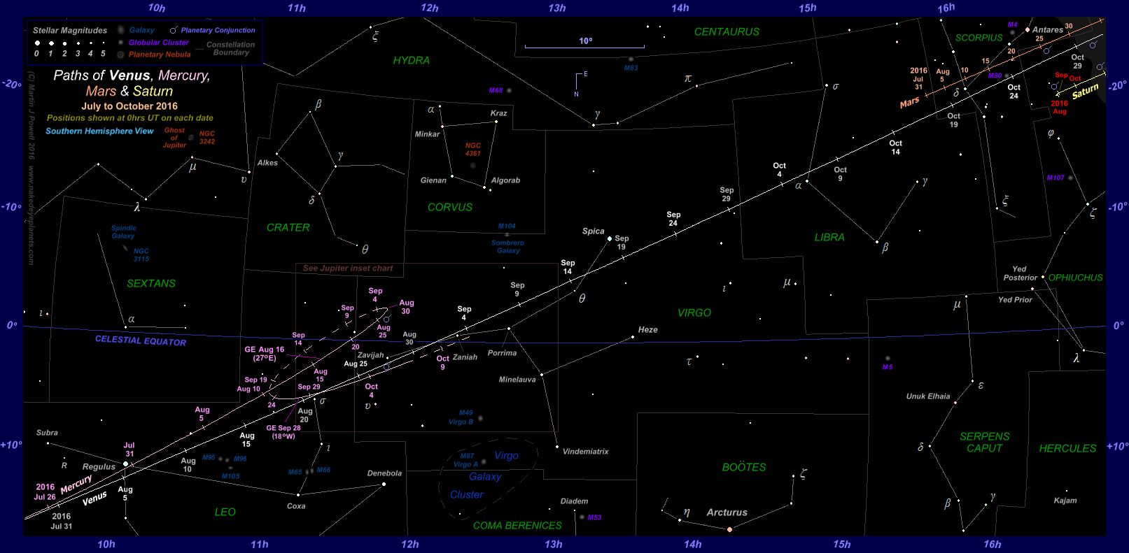 Over a period of a month commencing August 4th, Venus, Mercury and Jupiter formed an interesting planetary grouping on the Leo-Virgo border, with the waxing crescent Moon joining the group from August 4th-6th. Jupiter, at magnitude -1.7, was now in the closing stage of its 2015-16 apparition, having spent most of the period in South-eastern Leo. Mercury was undergoing the second evening apparition of the year, there having been six full apparitions during 2016 (three in the morning and three in the evening).
