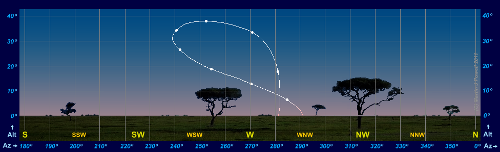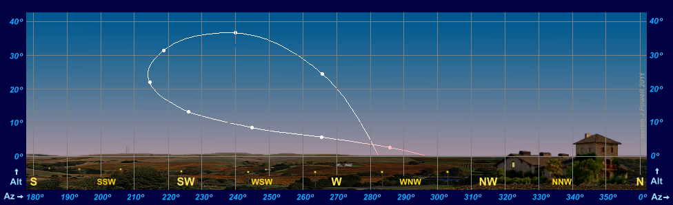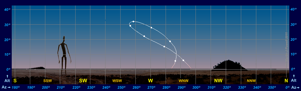 Around February 20th, observers at mid-Southern latitudes saw Venus return to the same relative spot above the local horizon that it had been positioned back in mid-August of 2016 (11º high in the WNW at 30 minutes after sunset), the planet having appeared to loop around the Western cardinal point over the course of the last seven months (see horizon diagram for 30° South below).
