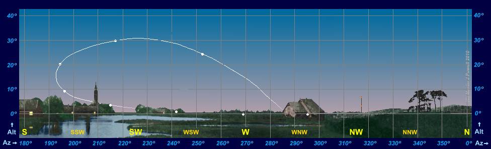 Observers at Equatorial and Northerly latitudes saw Venus' altitude at a given period after sunset fall away rapidly from early March. At the Equator, the planet's altitude in relation to the local horizon was in a vertical drop by mid-March, falling from 10º high at 30 minutes after sunset on March 8th to just 4º high on March 13th - a fall of 1º.2 per day (see horizon diagram for the Equator below). Here, on March 10th, Venus returned to the same relative spot above the local horizon that it was back in early August of 2016 (8º high in the WNW at 30 minutes after sunset). Mid-Northern latitudes saw a steep drop after the first week of March, the planet falling at a rate of about 1º.3 per day through to mid-March. At 60º North latitude in early March, the planet was placed 23º high in the West at 30 minutes after sundown, but by mid-March it had fallen to 14º - an altitudinal drop of about 0º.9 per day over the period. South of the Equator, Venus' apparent position above the local horizon at a given time after sunset was seen to 'backtrack' slightly in the closing days of the apparition, the planet heading a little Southwards along the horizon once more.