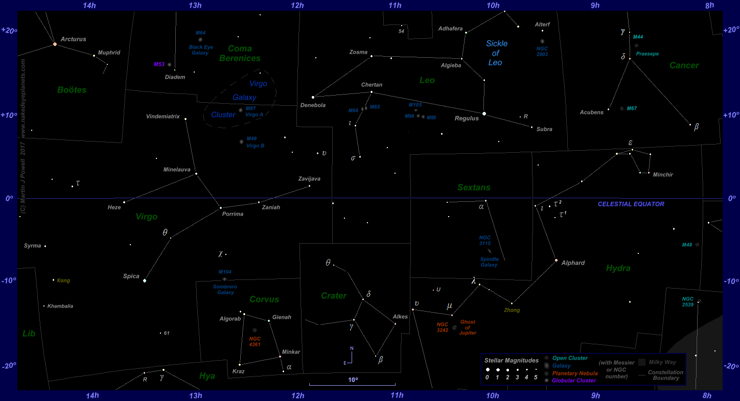 On March 9th Venus crossed the celestial equator (where the declination of a celestial body is 0°) heading Northwards, positioned some 3° East of the Sun's Vernal Equinox position (known historically as the First Point of Aries) where celestial longitude measurement originates (ecliptic longitude = 0° and Right Ascension = 0h 0m 0s). The planet now set between one and 1½ hours after sunset at Northern latitudes, one hour after sunset at Equatorial latitudes and 40 minutes after sunset at mid-Southern latitudes. Being positioned so close to the celestial equator at this time, the planet set due West across the inhabited world.