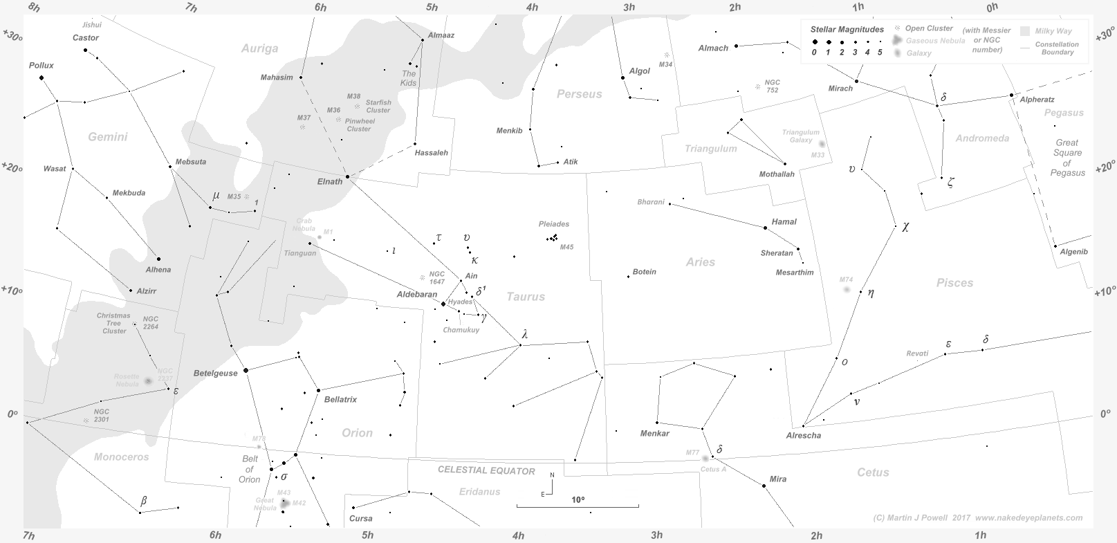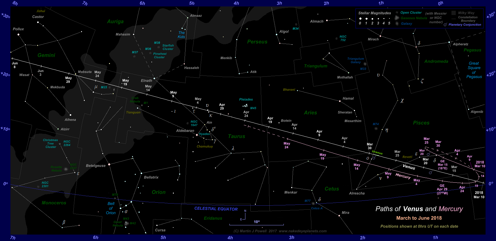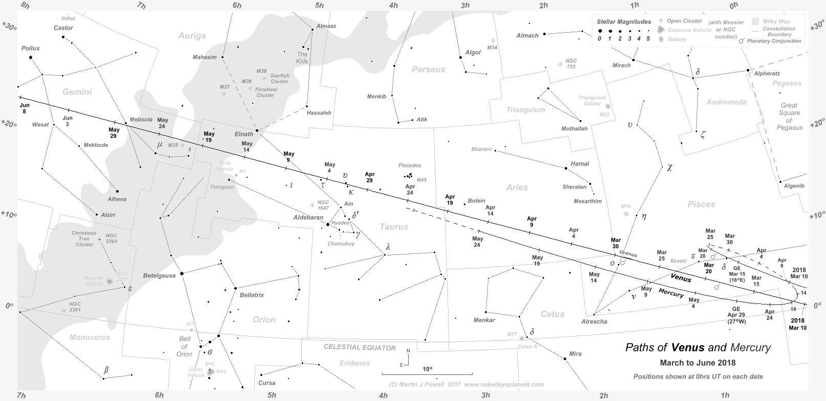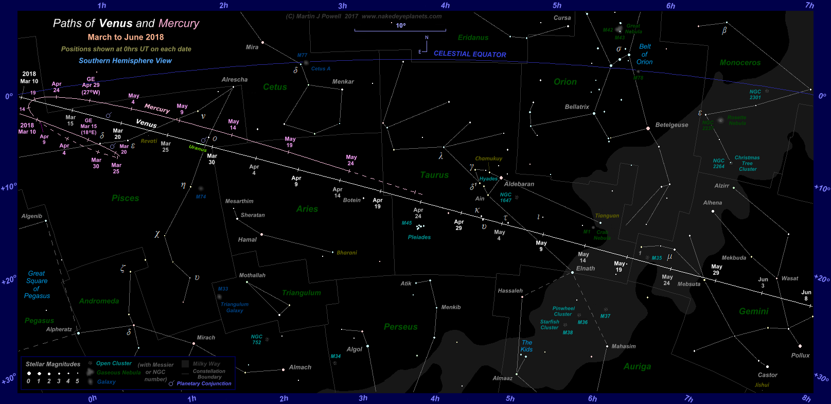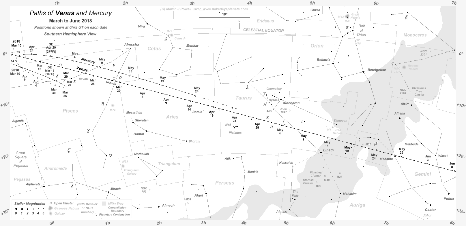 Venus entered the Chart 1 coverage on March 10th, at which time Mercury was positioned 3°.1 to the North-east of Venus. The elusive planet was 3°.4 North-east of Venus on March 11th and 3°.7 North-east of it on the 12th, when Venus reached a solar elongation of 15° East.