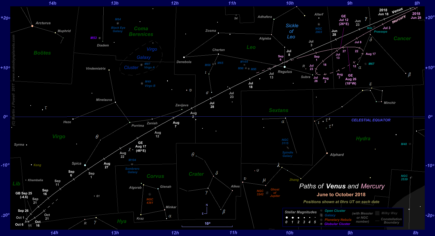 The paths of Venus and Mercury through the zodiac constellations during the latter part of Venus' evening apparition in 2018 (click on the thumbnail for the full-size image). The earlier part appears in the star chart below. Positions are plotted for 0 hrs Universal Time (UT) at 5-day intervals. For Venus, apparition data for the dates shown in bright white (at 10-day intervals) are included in the table below. Wherever a planet was too close to the Sun to view, the path is shown by a dashed line (- -). For Mercury, both evening and morning apparitions are included. Hence Mercury's evening apparition drew to a close in late July 2018. It then became lost from view in the evening twilight as it headed towards inferior conjunction with the Sun. The planet then re-emerged in the dawn twilight in mid-August for a morning apparition which lasted through to early Sepetmber. Because Mercury is mostly seen in twilight, many of the fainter stars shown in the planet's vicinity may not have been visible when the planet itself was observed. The positions at which Mercury and Venus attained greatest elongation from the Sun are indicated by the letters 'GE', with the solar elongation angle in brackets. The June/July evening apparition of Mercury favoured Southern hemisphere observers (who should refer to the Southern hemisphere chart for a more appropriate orientation) whilst the morning apparition of August/Sepember favoured Northern hemisphere observers. The position at which Venus attained greatest brilliancy for this apparition (apparent magnitude = -4.6) is shown by the letters 'GB'. Click here to see a 'clean' star map of the area (i.e. without planet paths); a printable version can be found here. The faintest stars shown on the chart have an apparent magnitude of about +4.8. Printer-friendly versions of this chart are available for Northern and Southern hemisphere views. Astronomical co-ordinates of Right Ascension (longitude, measured Eastwards in hrs:mins) and Declination (latitude, measured in degrees North or South of the celestial equator) are marked around the border of the chart. Star names shown in yellow-green were officially adopted by the International Astronomical Union (IAU) in 2017. The two such star names shown on this chart were drawn from Chinese mythology (more details are given in the main text). |