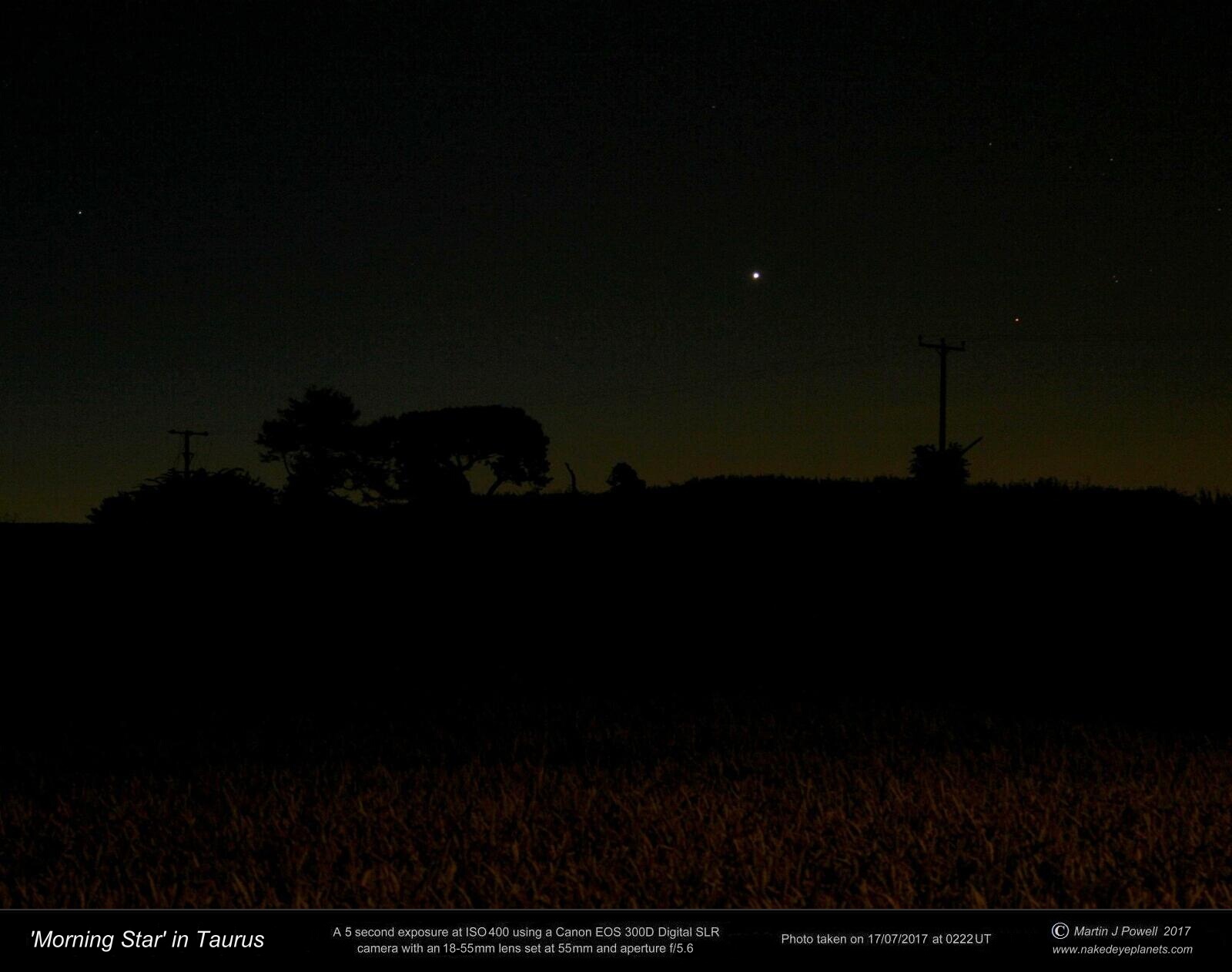 About half-way along the Bull's Southern horn is the unremarkable fifth-magnitude star 104 Tauri (mag. +4.9); Venus passed 7'.9 (0.13) to the South of it on July 24th at 0105 UT. Venus will occult this star on the same calendar date during its morning apparition in 2028, eight years hence (i.e. one Venus 'cycle' - for more details, see the accompanying article describing The Venus 8-year Cycle).